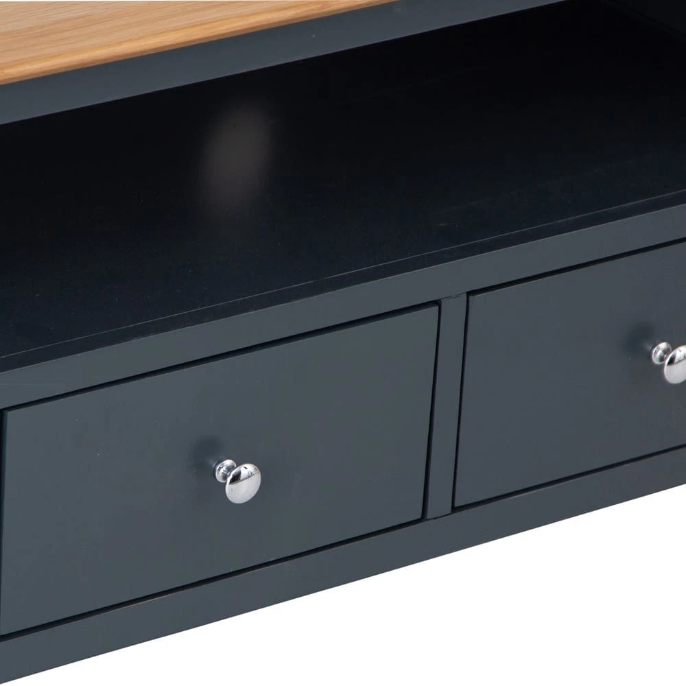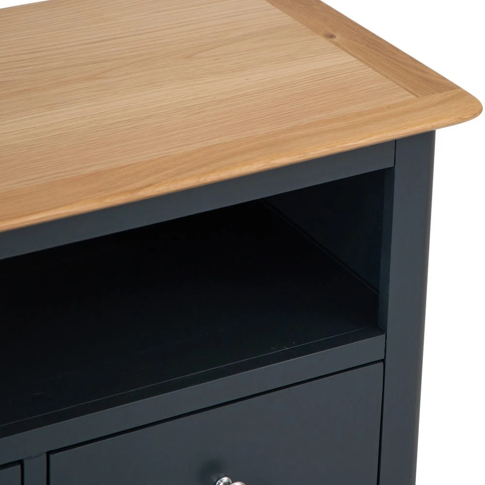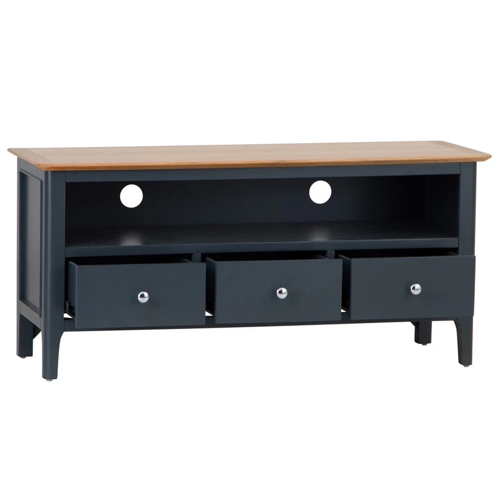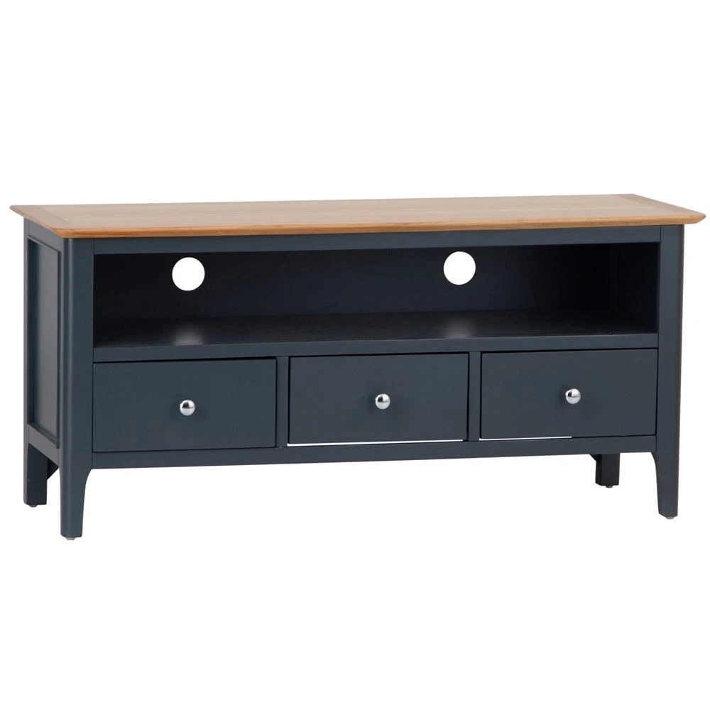 Settle down for a cosy film night snuggled up beneath your warmest blanket. Your TV will look fantastic on top of the Bergen blue painted oak large TV unit, placed in prime position in your living space.