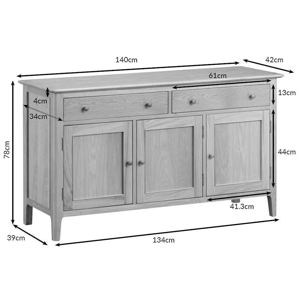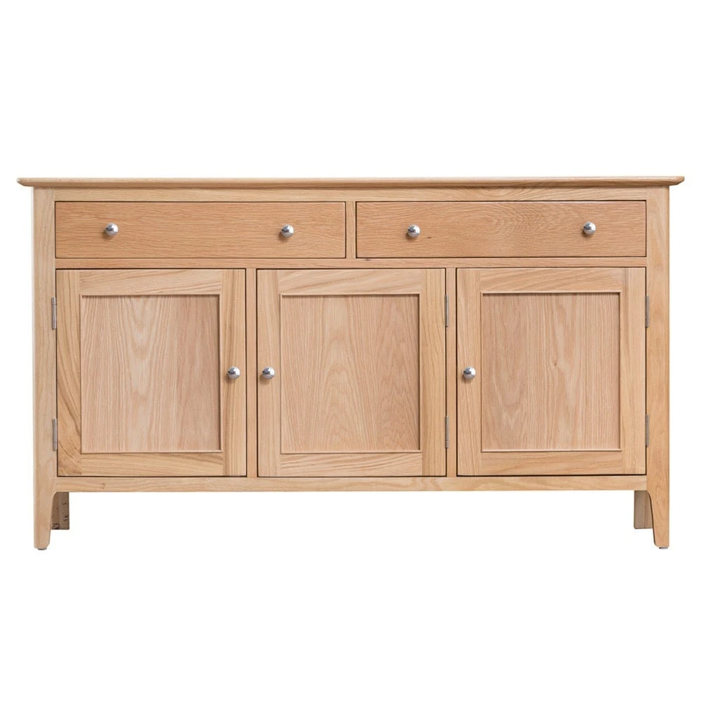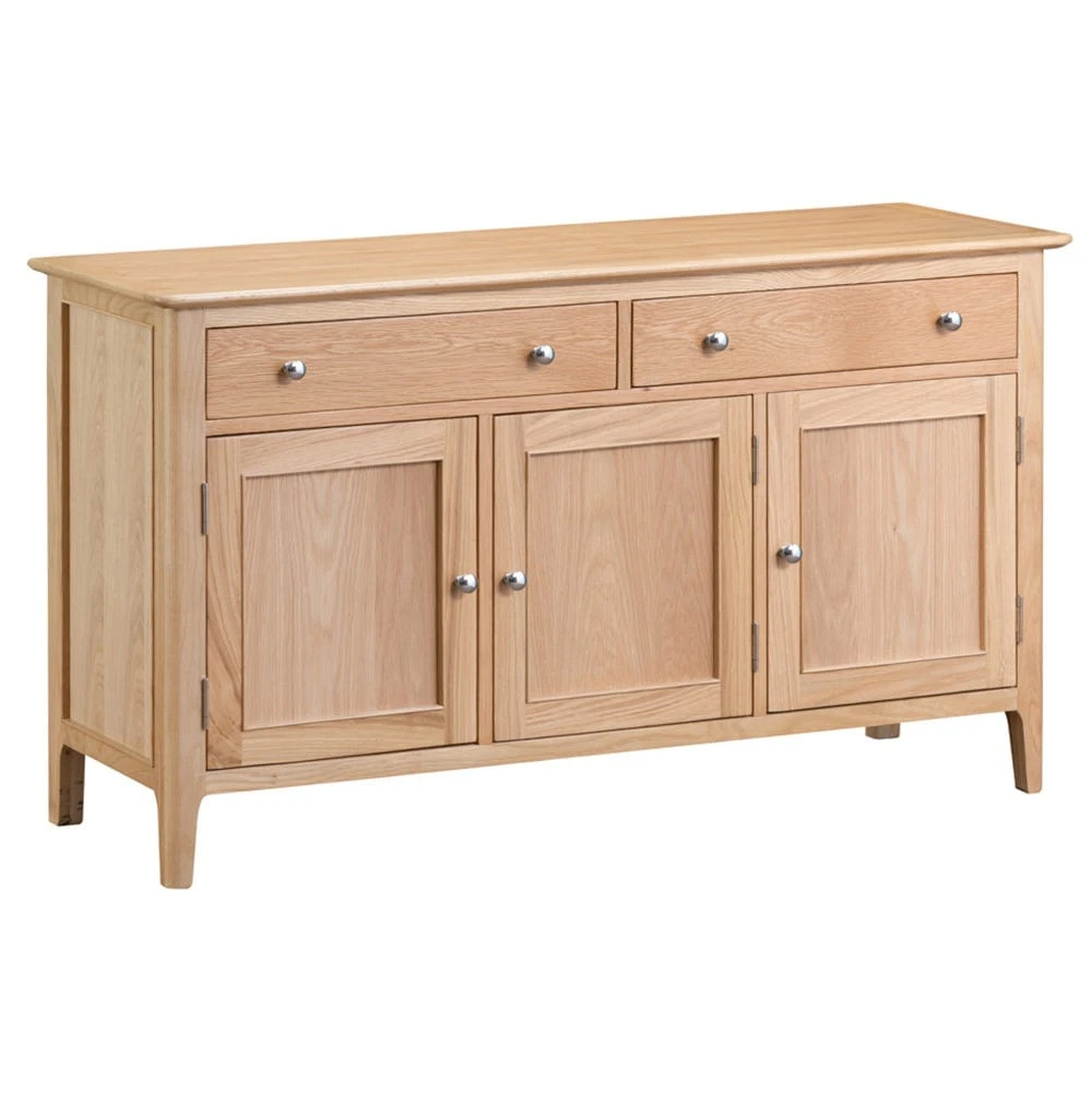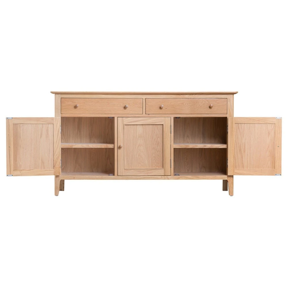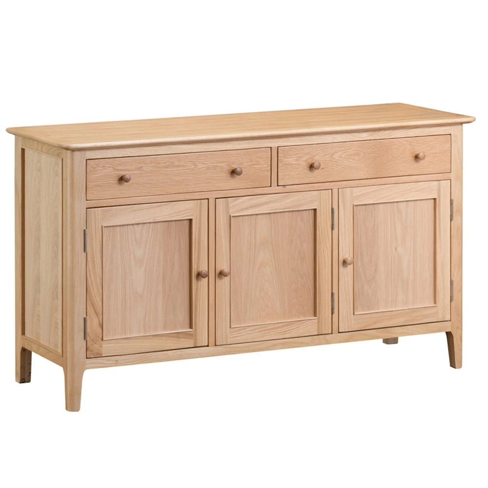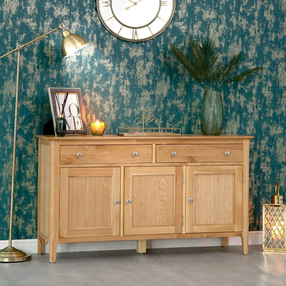 The Bergen oak large three-door sideboard makes a sophisticated statement stood at the side of whichever room you decide to place it in. Finished in silky oak, the neat lines of the wooden panelling are complemented by its smooth edges and slender legs.