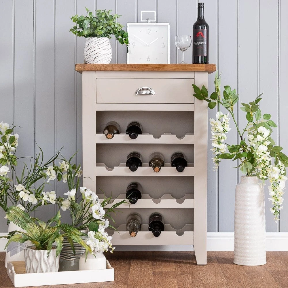 Clink your glasses and raise a toast to the stylish and practical Chester stone painted oak wine cabinet. Proudly display your wine collection when you invite everyone over for your next fabulous dinner party.