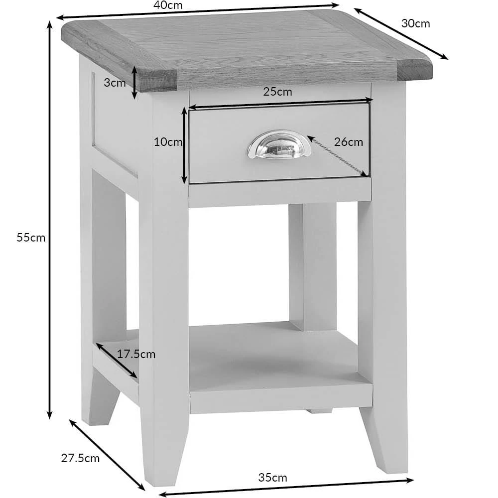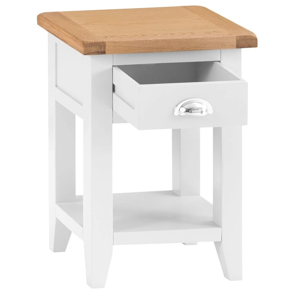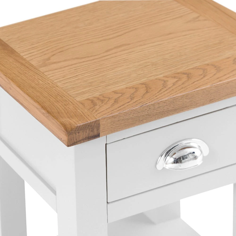 If you want a lamp table that’ll easily fit in anywhere, look no further than the Chester white painted oak one drawer small lamp table.