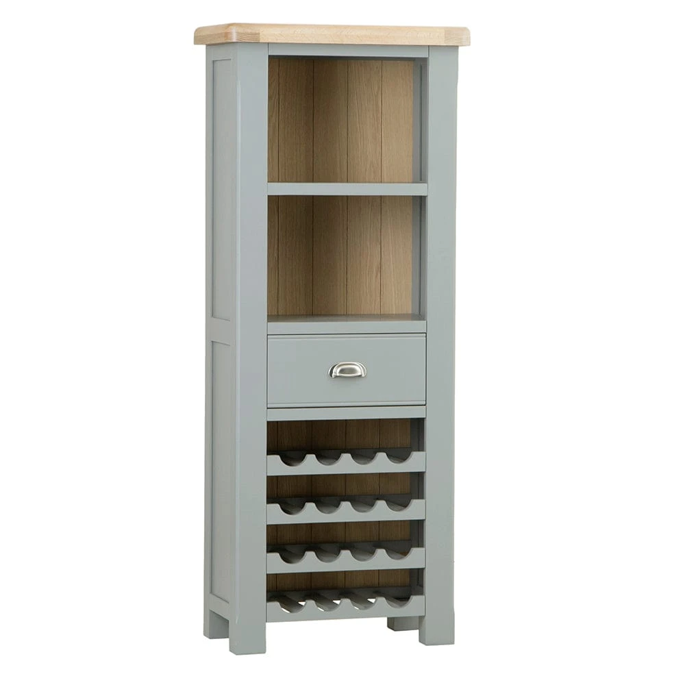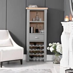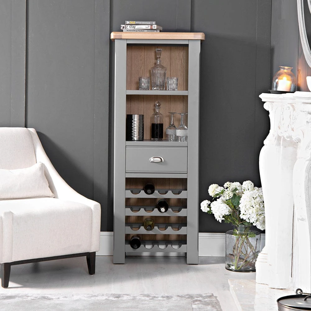 Slender and sophisticated, this tall wine cabinet is perfect for those that don’t want a wideset piece of furniture taking up too much floor space. Sleek, chic, and elegant, the shelves at the top can act as a cabinet bar for liquors, glasses, and assorted accessories whilst the wine racks at the base of the piece mean there’s no need for a wine cupboard as you can keep your bottle collection organised and on display.