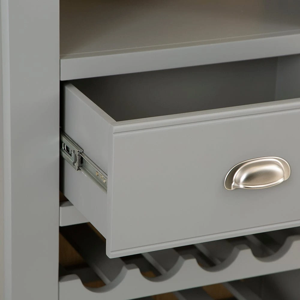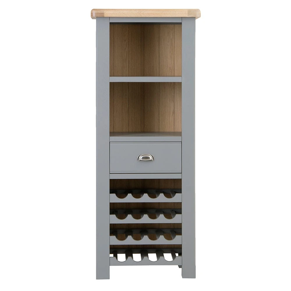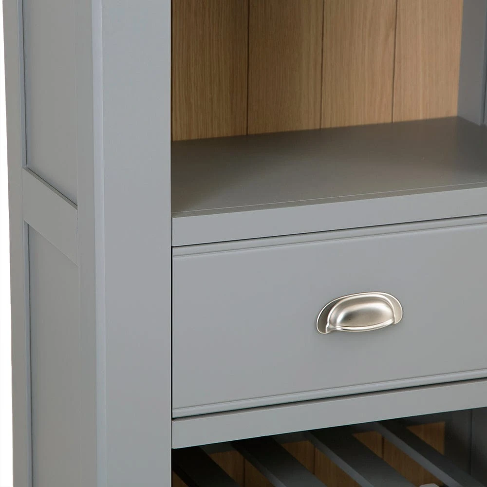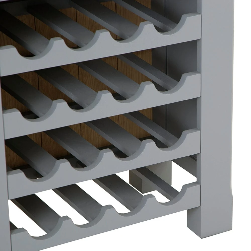 Fixed shelving makes sure any glassware stays safe and secure, and the central draw is the perfect place to keep bottle openers, mixing equipment or any other items. Complete with a chrome cup-style handle and metal runners, it looks impressive and remains stable. Topped off with chunky oak that has rounded edges and a light whitewash for a soft visual appeal, the rest of the item is finished in a sophisticated storm grey colour that suits an array of settings, making it the perfect way to get the party started.