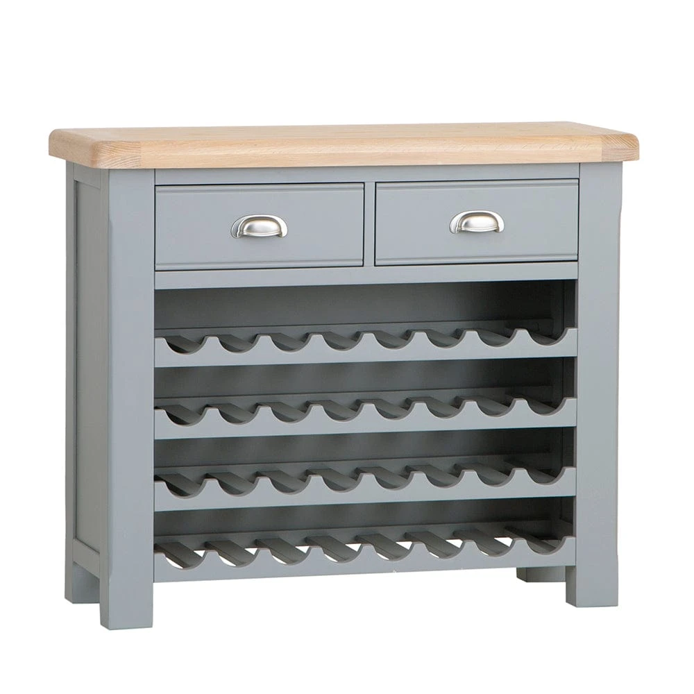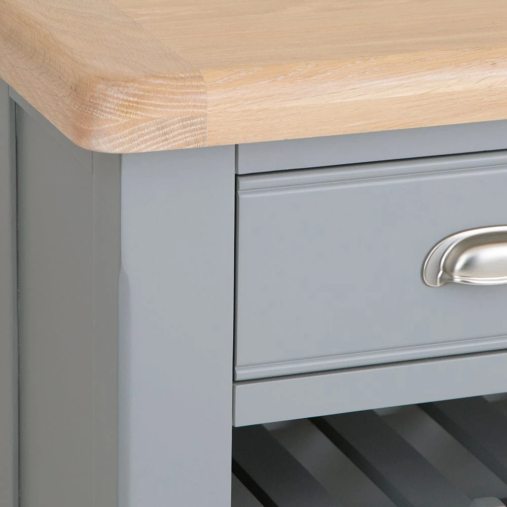 The chunky oak top is lightly whitewashed and has rounded corners so it has a soft and settling air to it, whilst the body of the cabinet is a neutral storm grey that can fit into a multitude of styles and settings. The two drawers are set on metal runners for sturdiness and have sleek chrome cup handles for a bold, modern look, and are great for holding bottle openers and other accessories. With free 2-man delivery to your door, this piece arrives fully assembled so you can instantly start enjoying it and have a centrepiece that will get any party started.