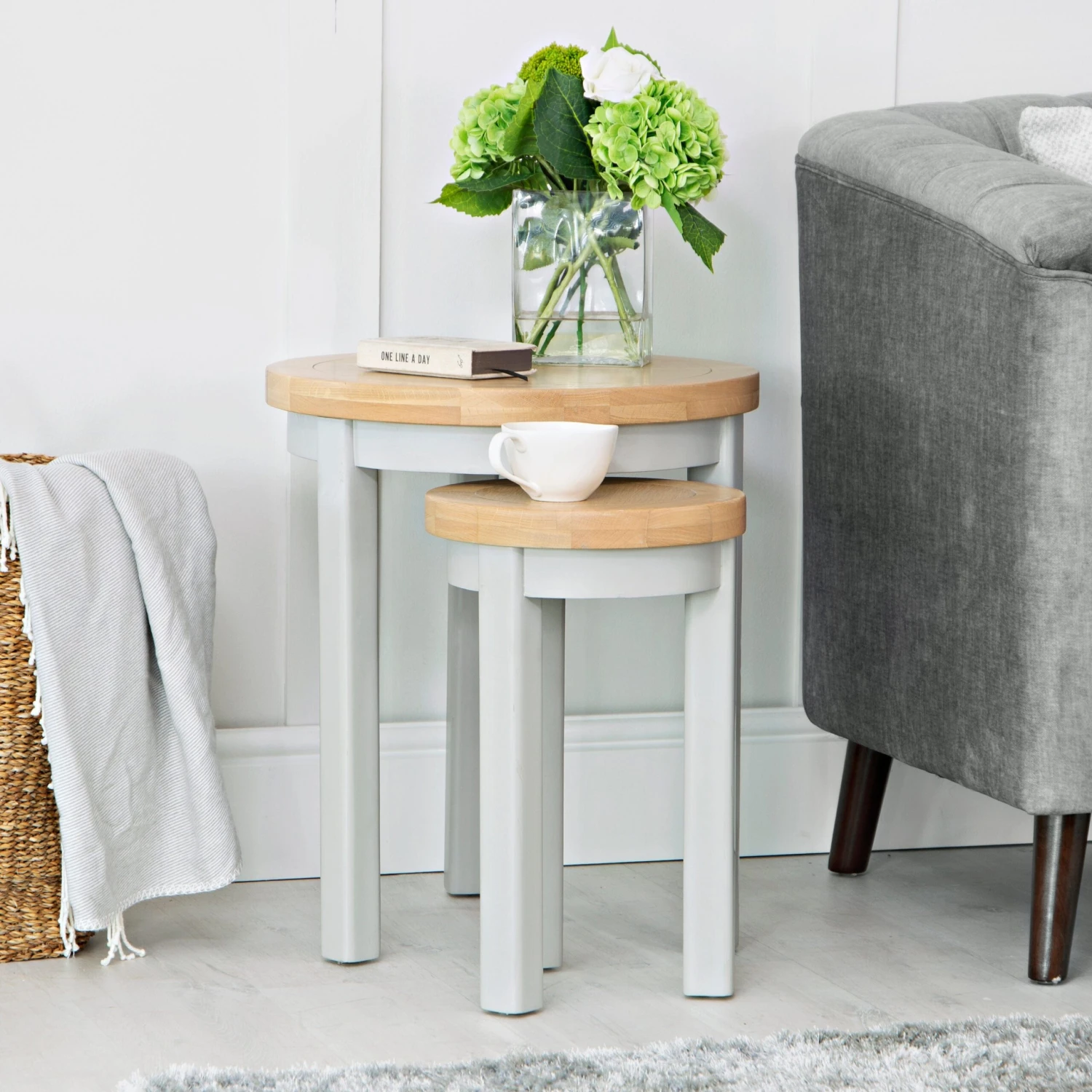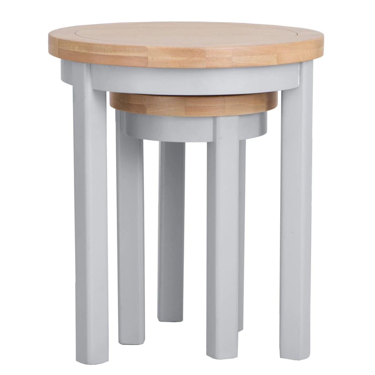 Elevate your living space with the Eaton Grey Painted Oak Round Nest Of 2 Tables. Fashioned with a painted grey finish, these tables feature lime-washed round tops that add a touch of rustic beauty and warmth to any room. Sleek and sophisticated, the Nest Of 2 Tables provide the perfect stage for drinks, books, and décor.