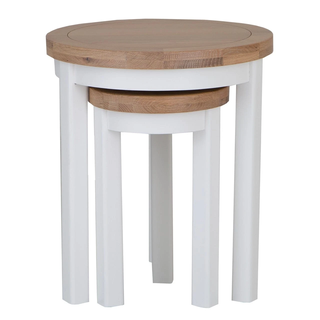 Crafted from painted oak and featuring a lime-washed top, the Eaton White Painted Oak Round Nest of 2 Tables brings a sophisticated, timeless look to any space. The round shape, delicate finish, and bright colour make it an exclusive addition to the home, adding elegance and tastefulness to any décor.