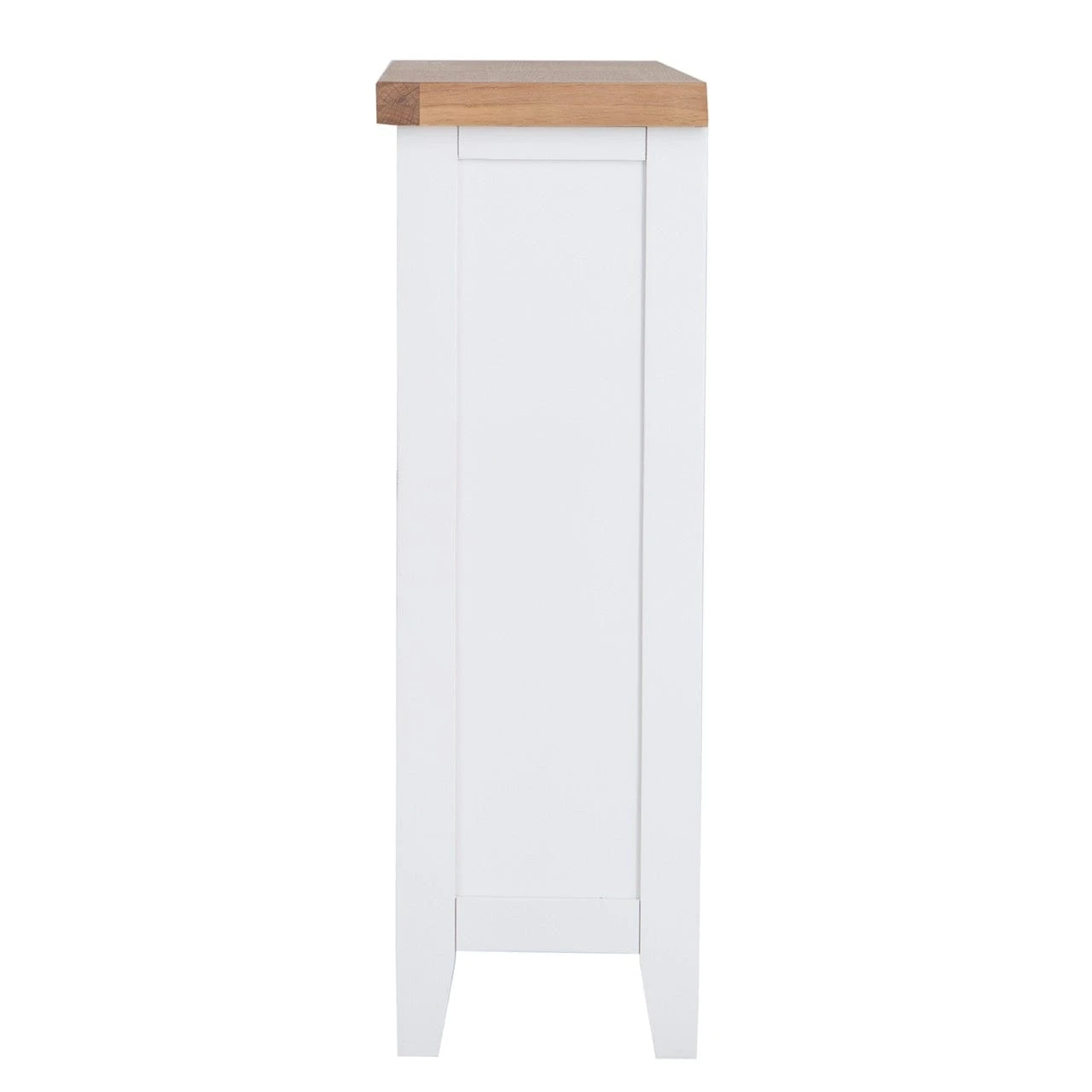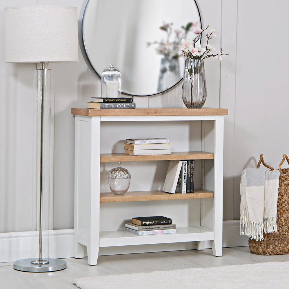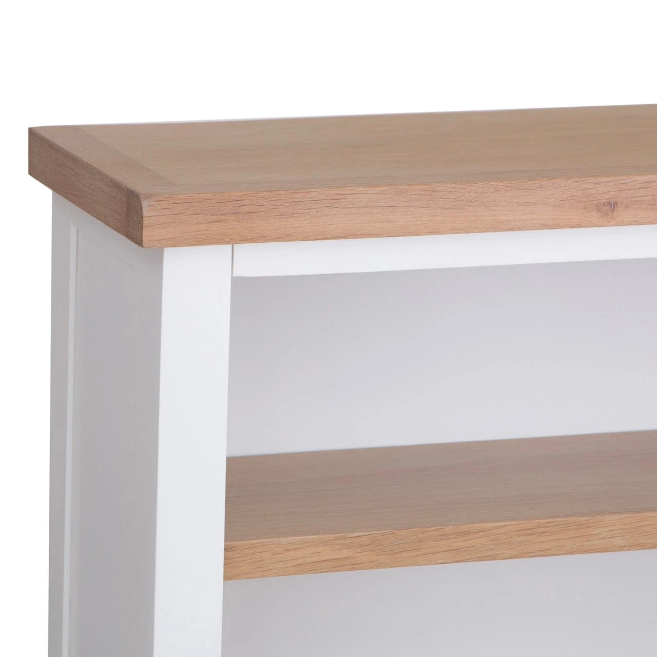 The Eaton White Painted Oak Small Wide Bookcase offers luxurious storage with an elegant design. A perfect fit for compact living spaces, it delivers a space-saving form with lime washed shelves and top that bring a subtle natural hue to any room. Ideal for displaying books, framed photographs, and other cherished possessions, this bookcase is a fitting choice for creating a stunningly sophisticated look.