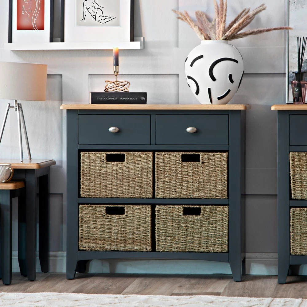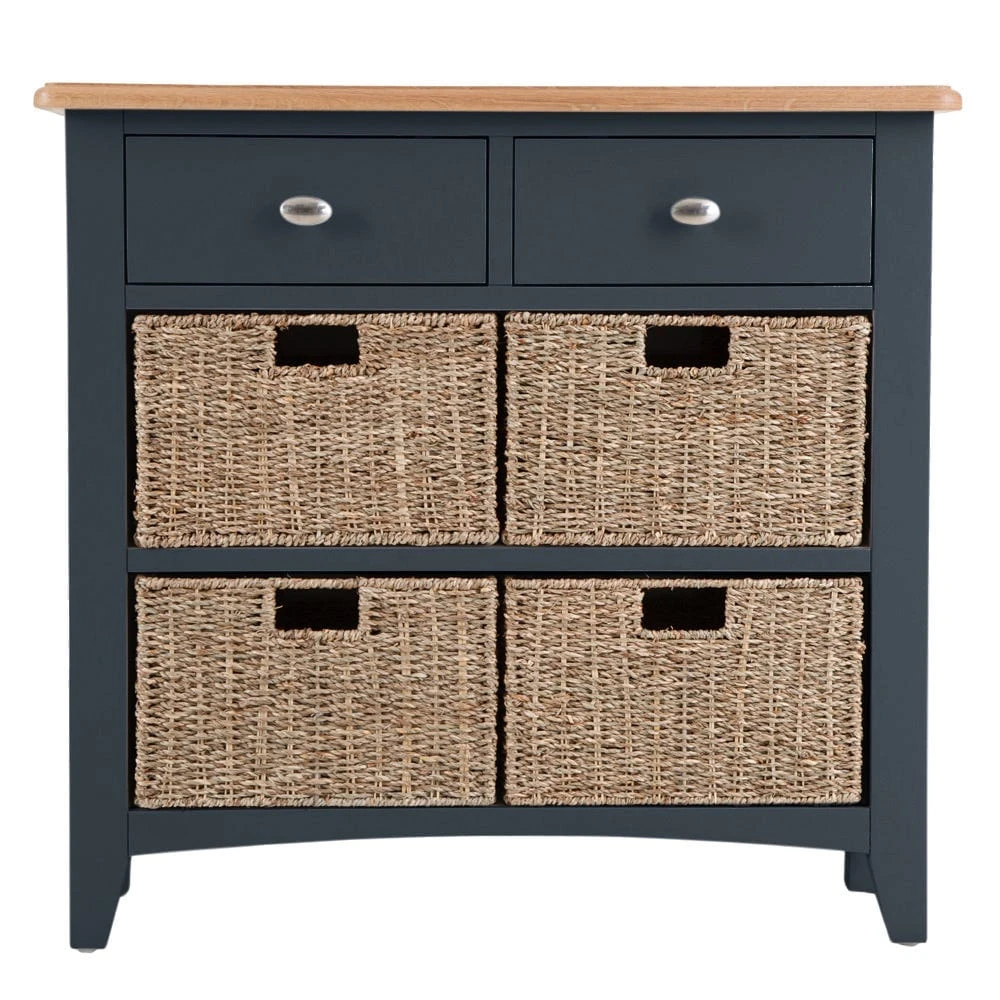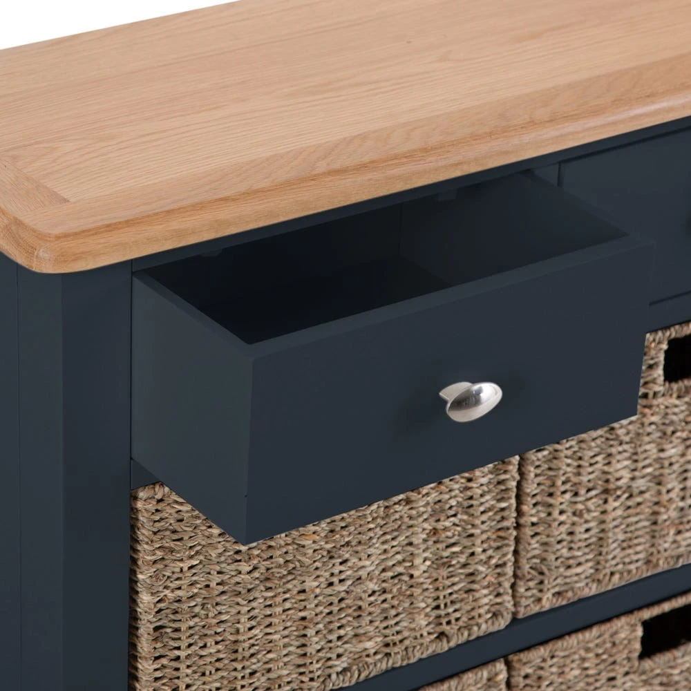 When the kids come home from after-school activities, you’ll have a handy spot to dump the muddy football boots and tennis balls with our Gloucester midnight grey painted 2 drawer 4 wicker basket cabinet.