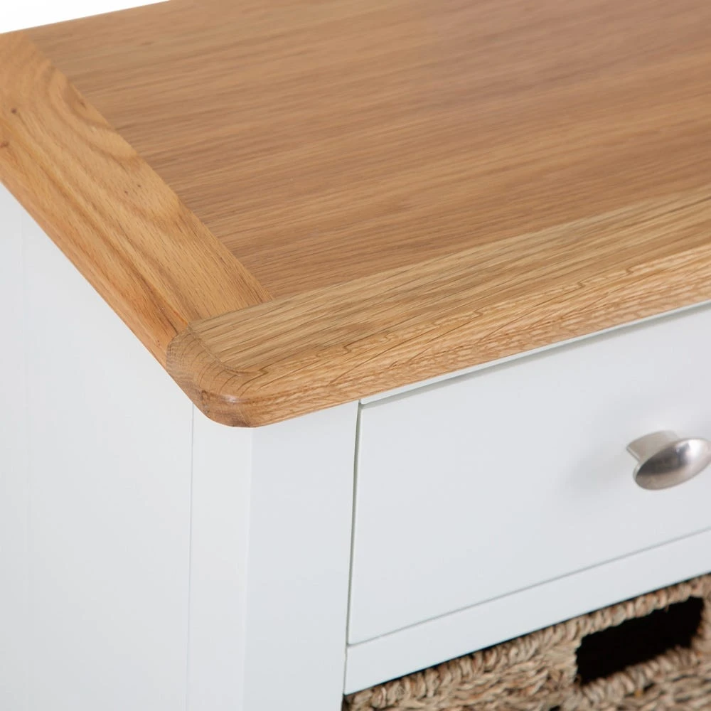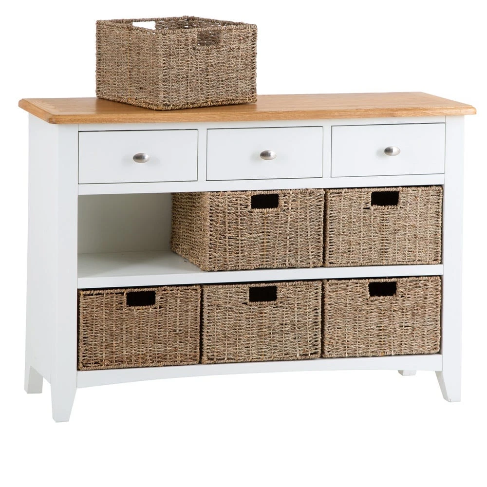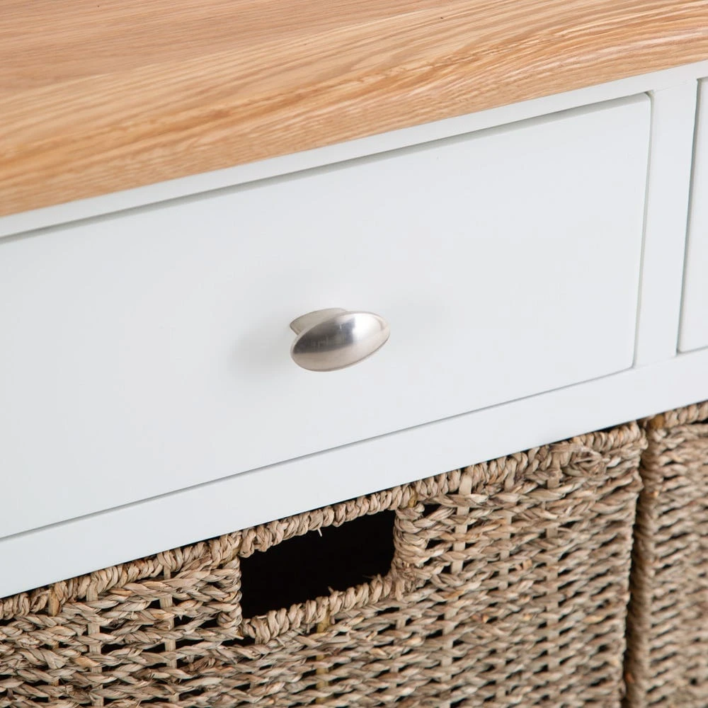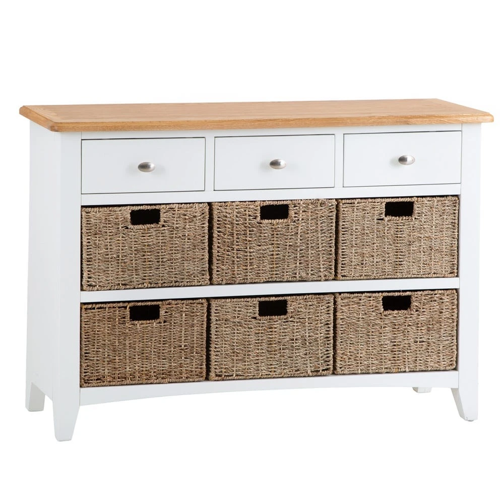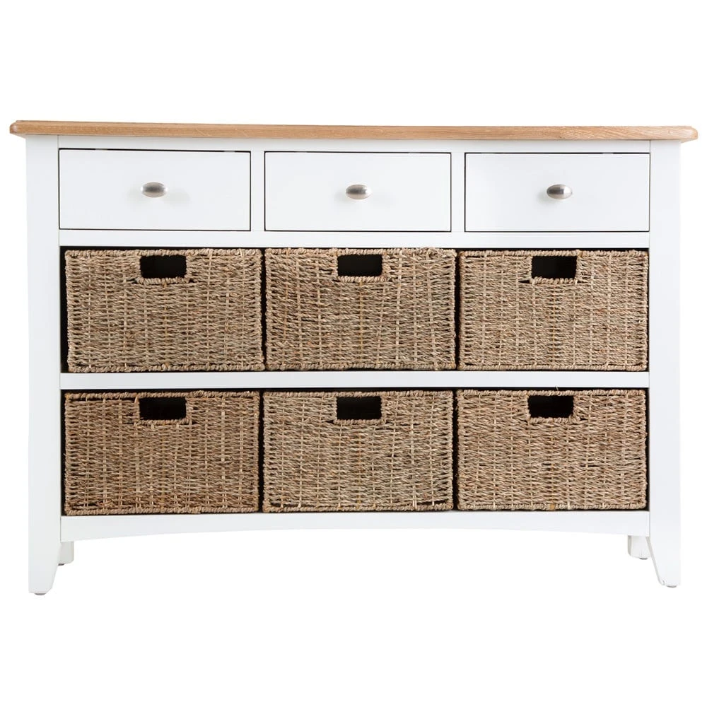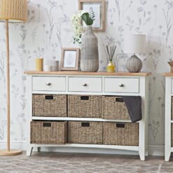 After you’ve put the kids to bed, give the living room a quick tidy up before settling in front of the TV. Place the toys of the day in your Gloucester white painted 3 drawer 6 wicker basket cabinet.