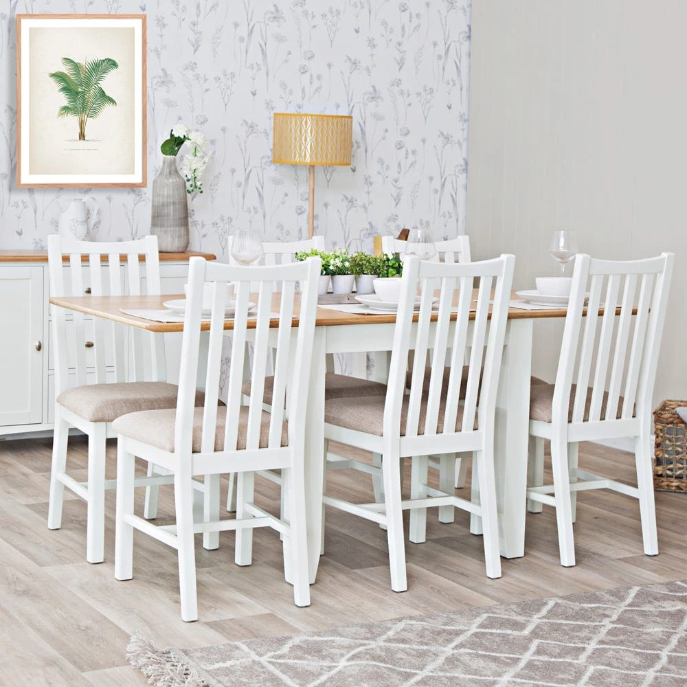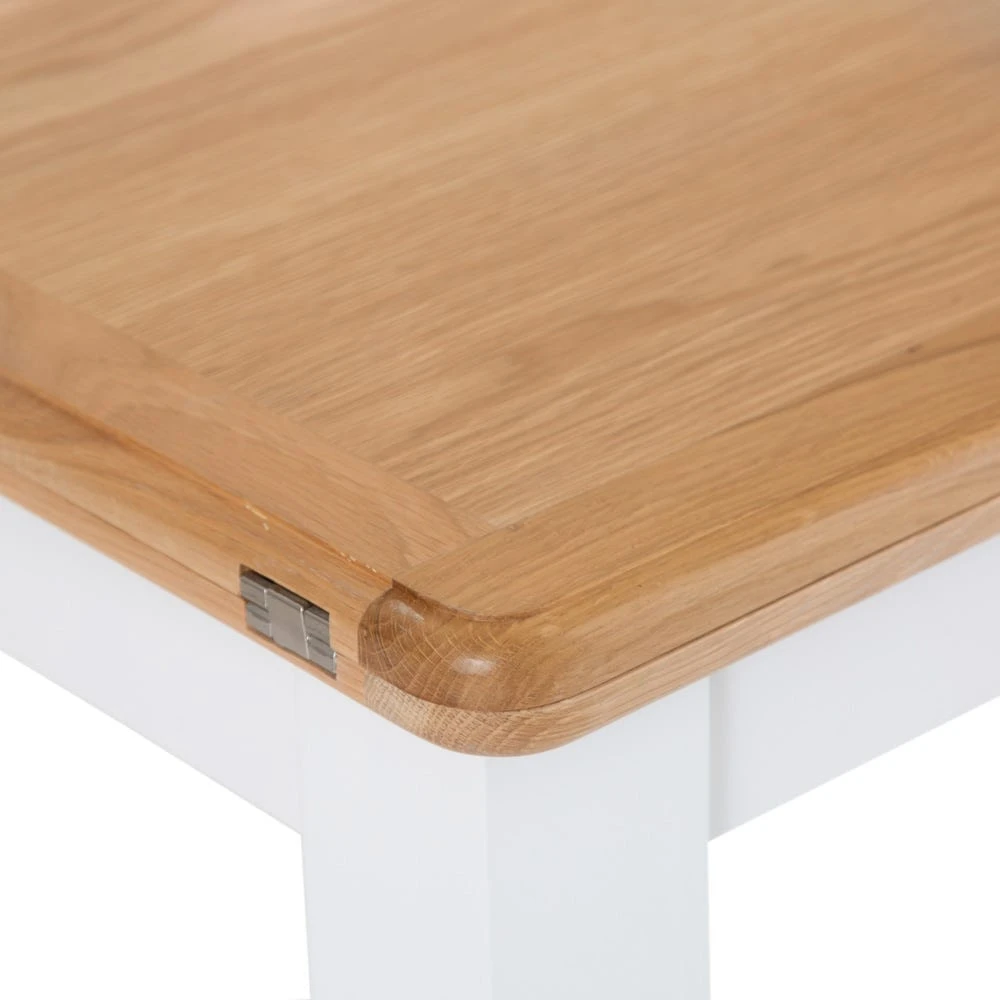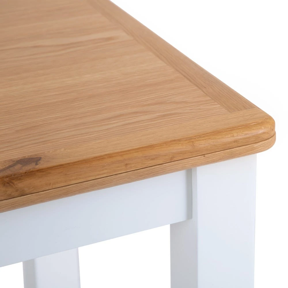 The hardy top is crafted from oak and oak veneer, and the bevelled detailing adds a little sophistication to your supper. The frame is finished in our distinctive subtle off-white, which keeps things clean and classic in your kitchen or dining room. Pair this piece with our matching dining chairs for a unified look.Â