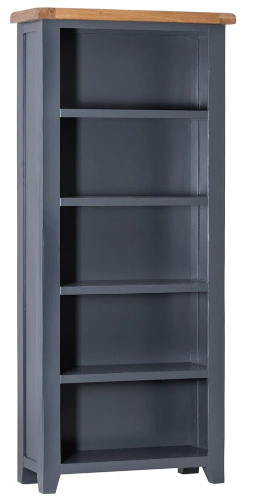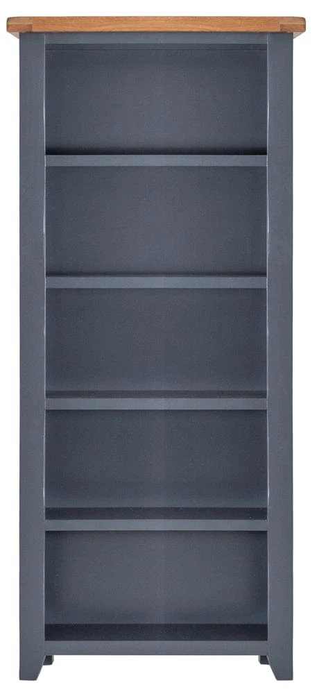 This Hampshire blue painted oak large bookcase is slender enough to fit easily into small spaces, adding interest and colour to bare walls. There are five generous fixed shelves, each hemmed in by lipped vertical edges to keep all your novels and non-fiction securely in place. The suitably sophisticated dark blue frame is offset by the rustic oak top, which has rounded corners for a soft finish.