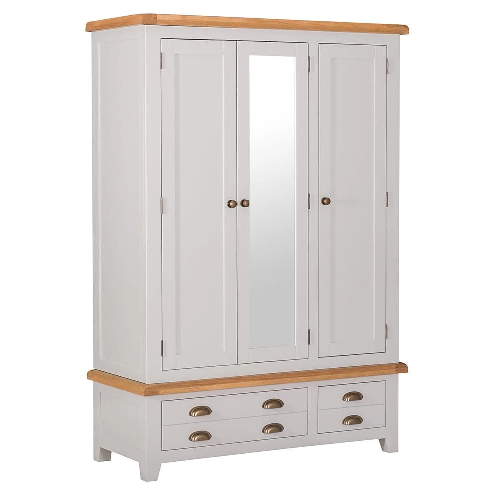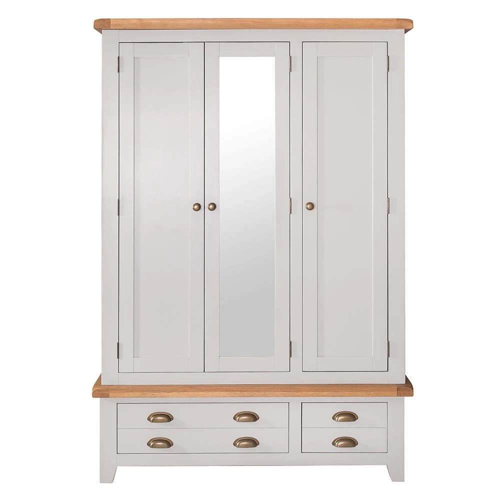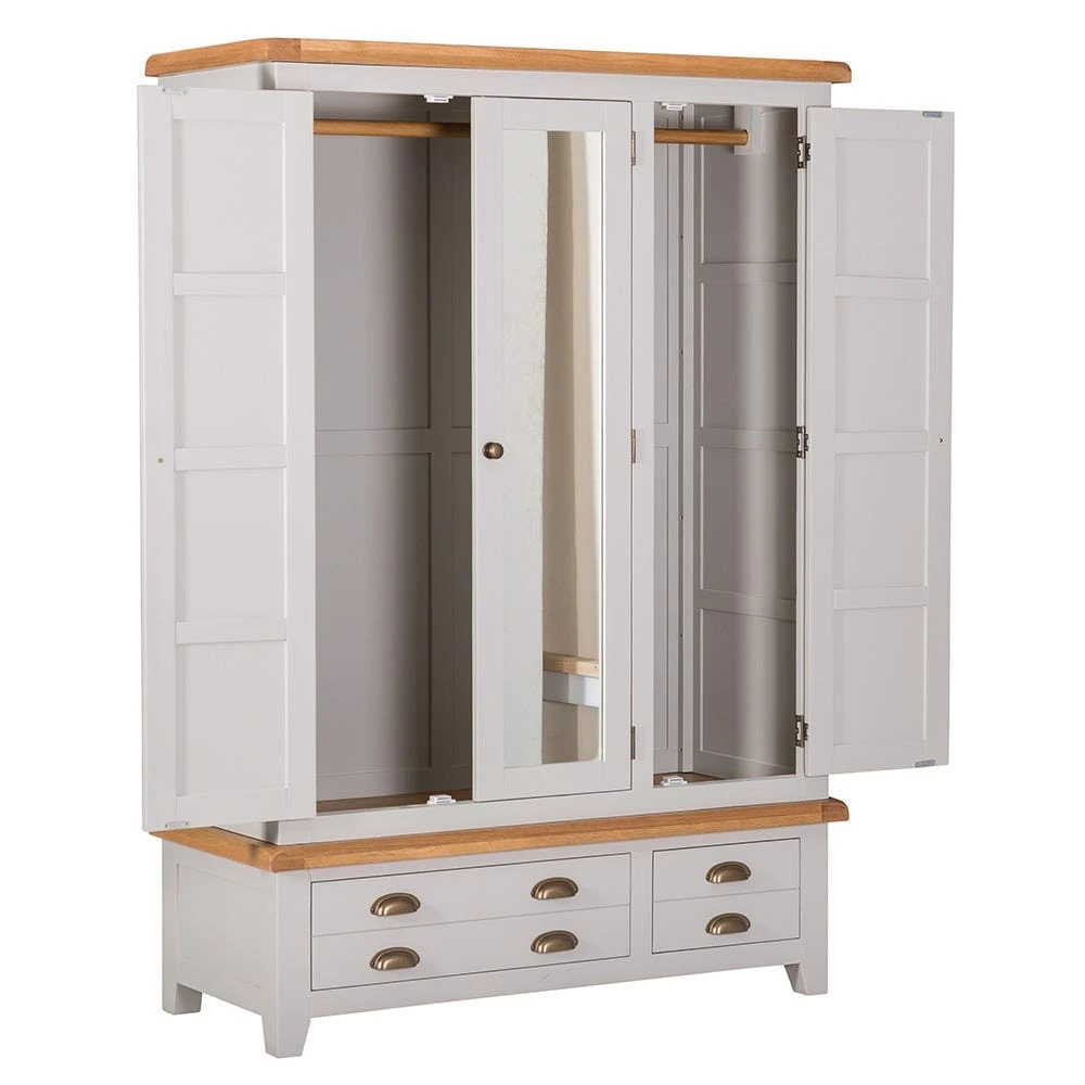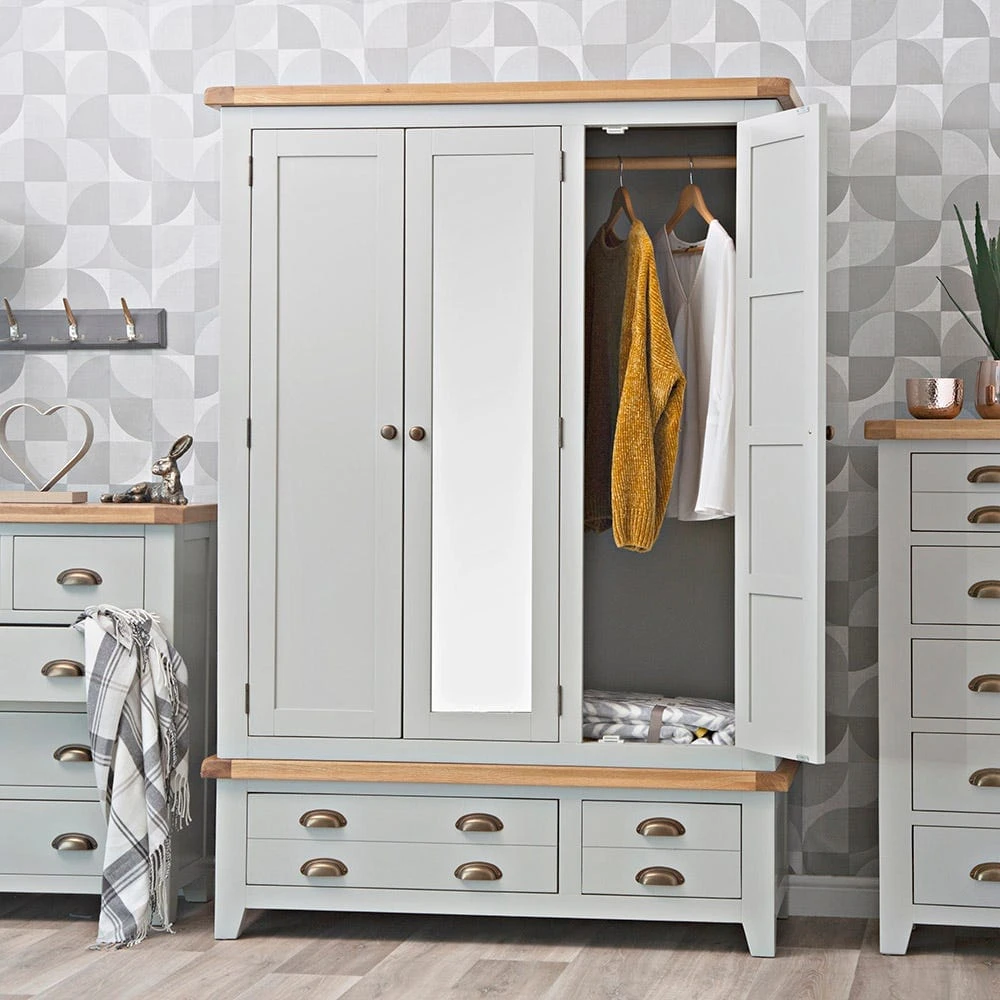 This Hampshire grey painted oak 3-door wardrobe with mirror combines storage wizardry with stunning looks to transform your bedroom. It has a generous 124cm of hanging width to satisfy even the most ardent bargain lovers and fashion fans.