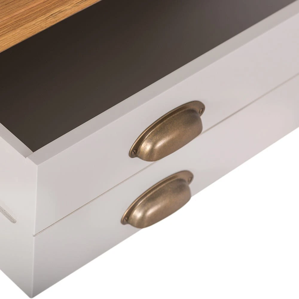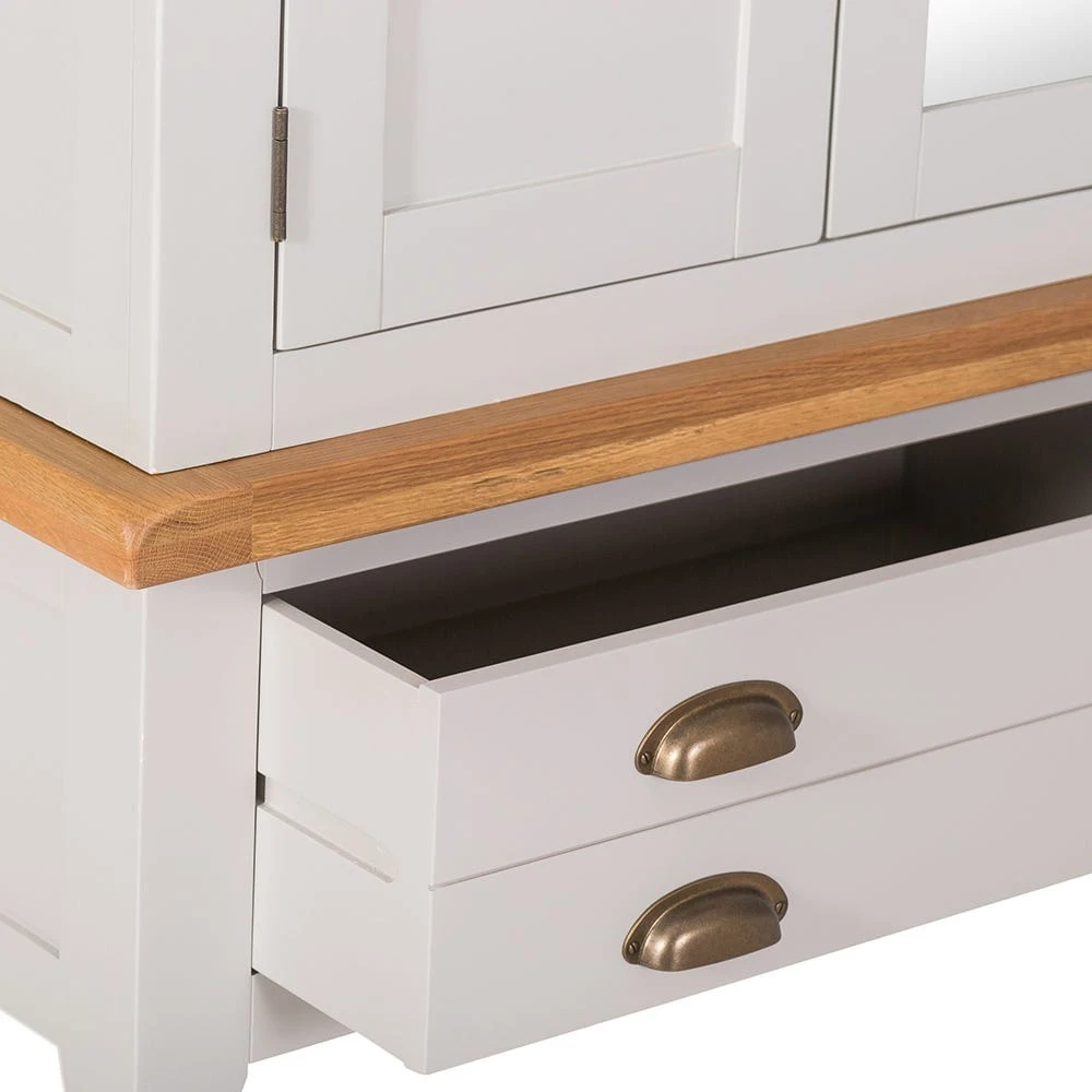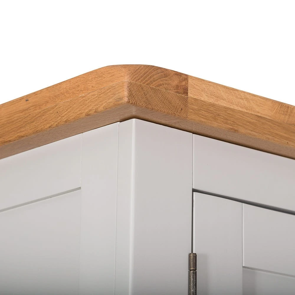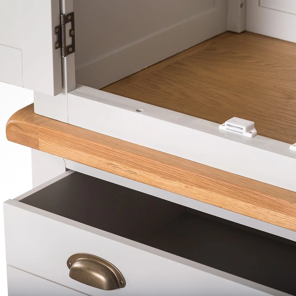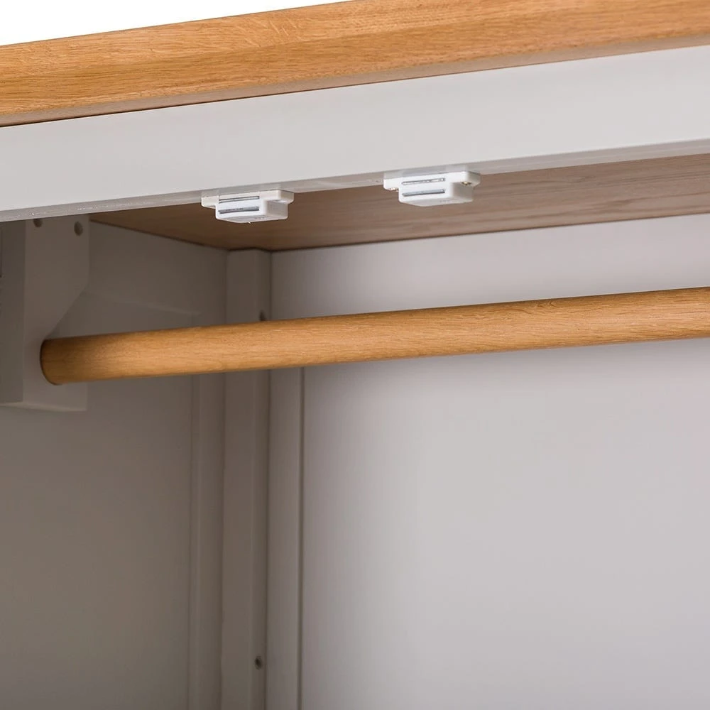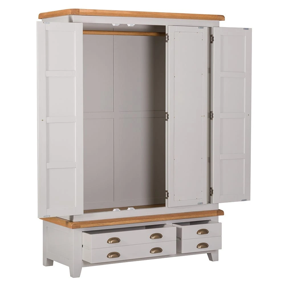 The pair of ample drawers have false double fronts featuring six of our brass-effect cup handles, and are perfect for ties, silk scarves, belts and other accessories. The natural oak top, trim and hanging rail offset the grey finish, which brings cool elegance to your bedroom. A full-length central mirror is perfect for that essential last glance before you head out for your first appointment of the day.