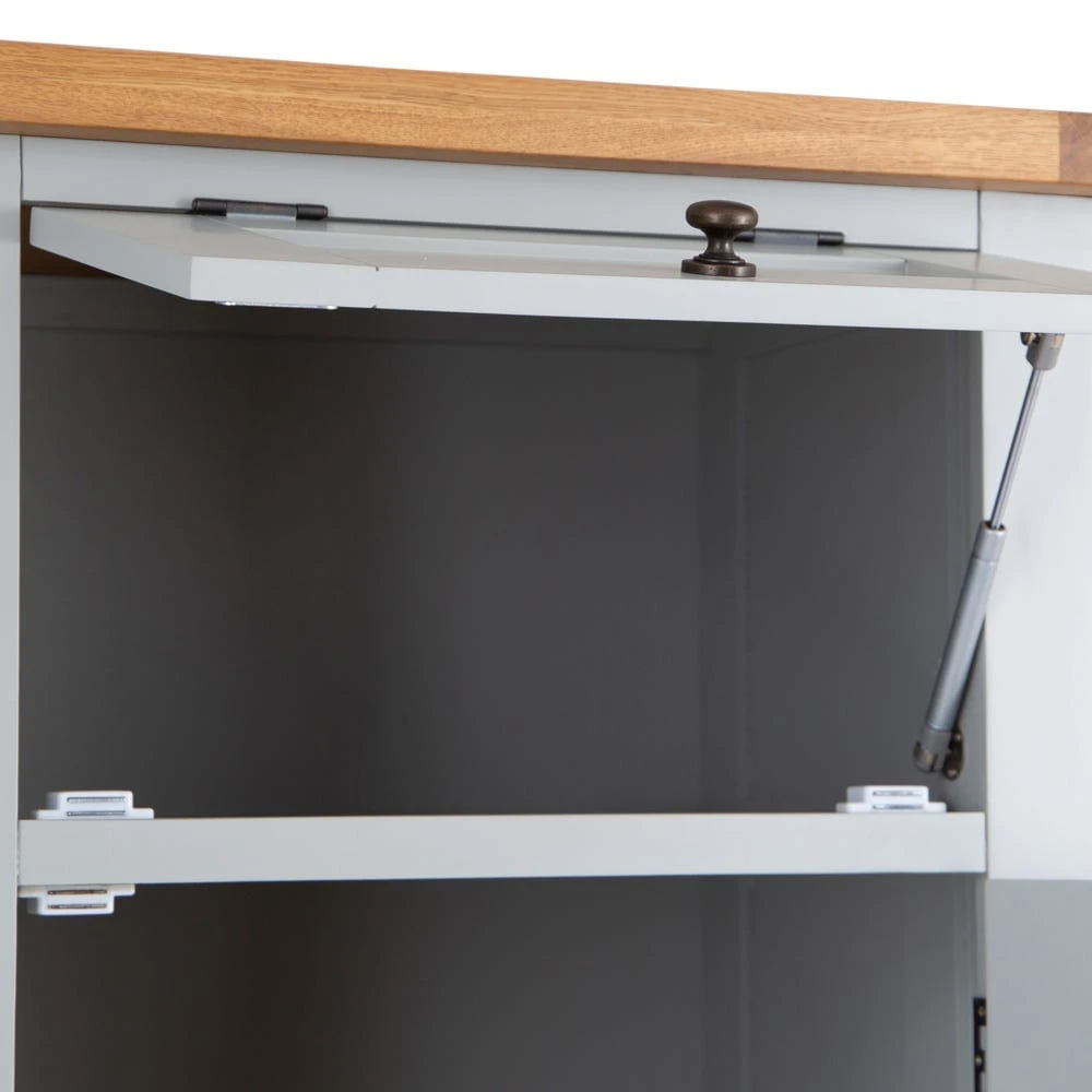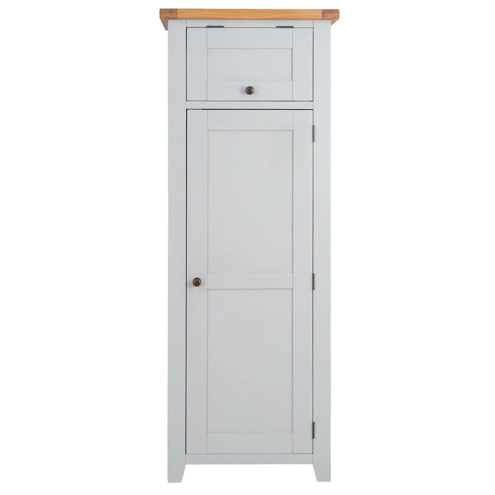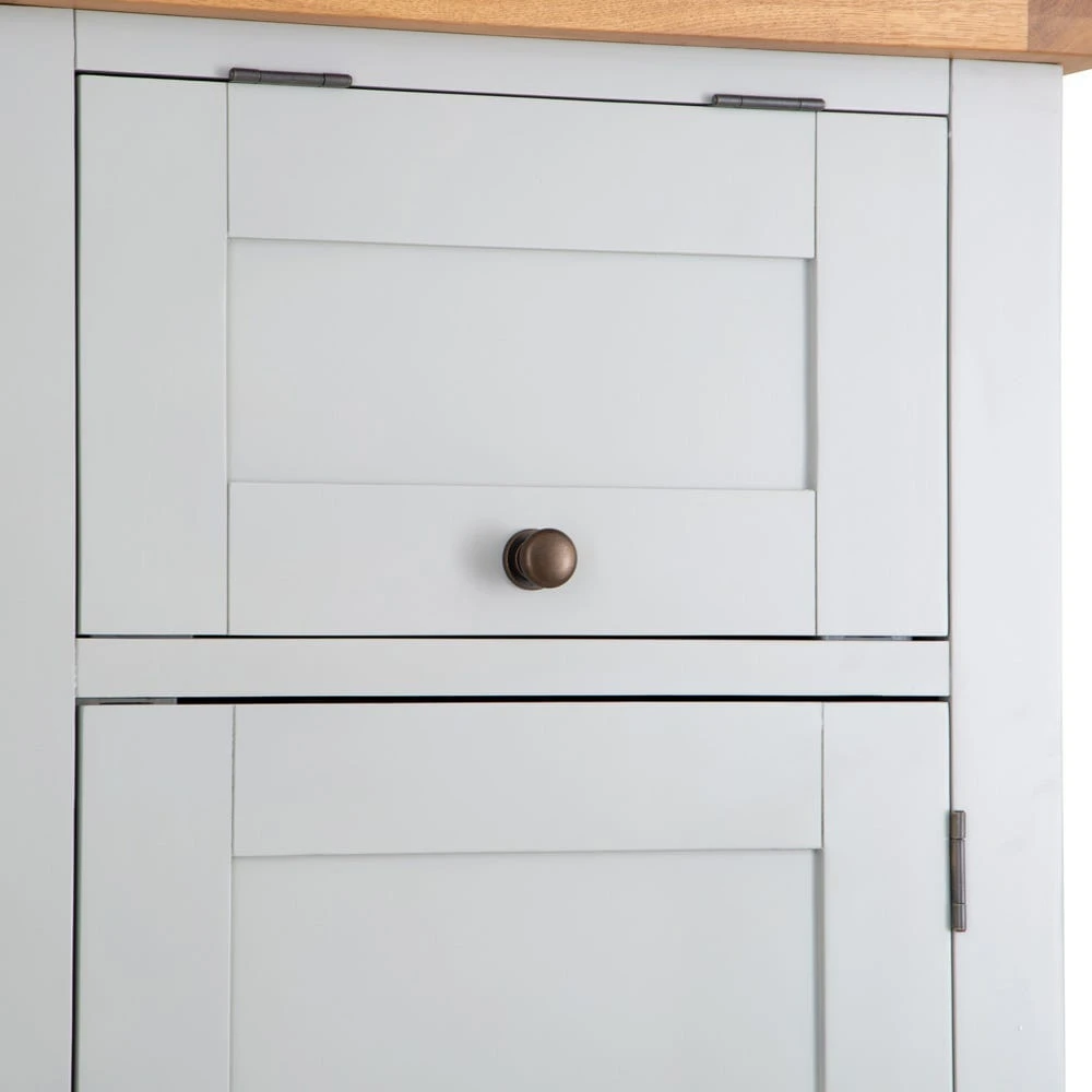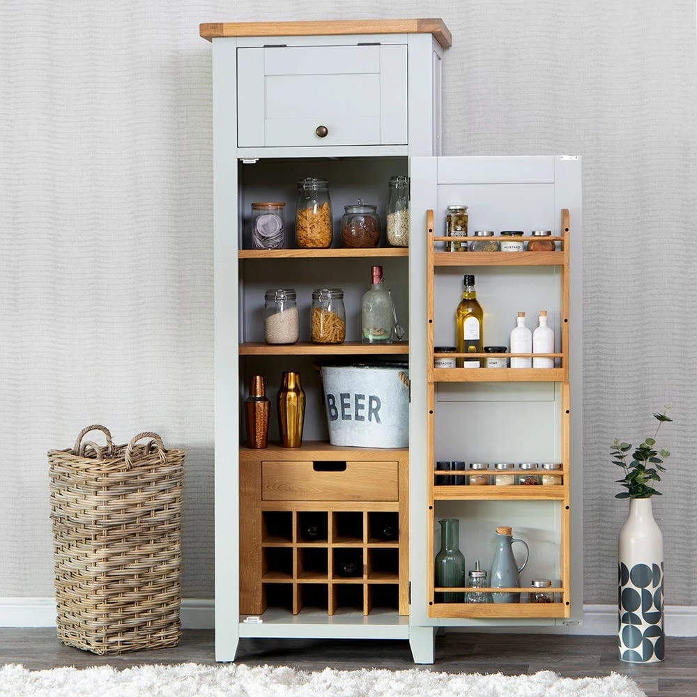 This Hampshire grey painted oak slim larder cupboard combines both looks and practicality to make meal planning a breeze. The warm oak interior complements our feather-light grey to bring traditional charm into your kitchen.