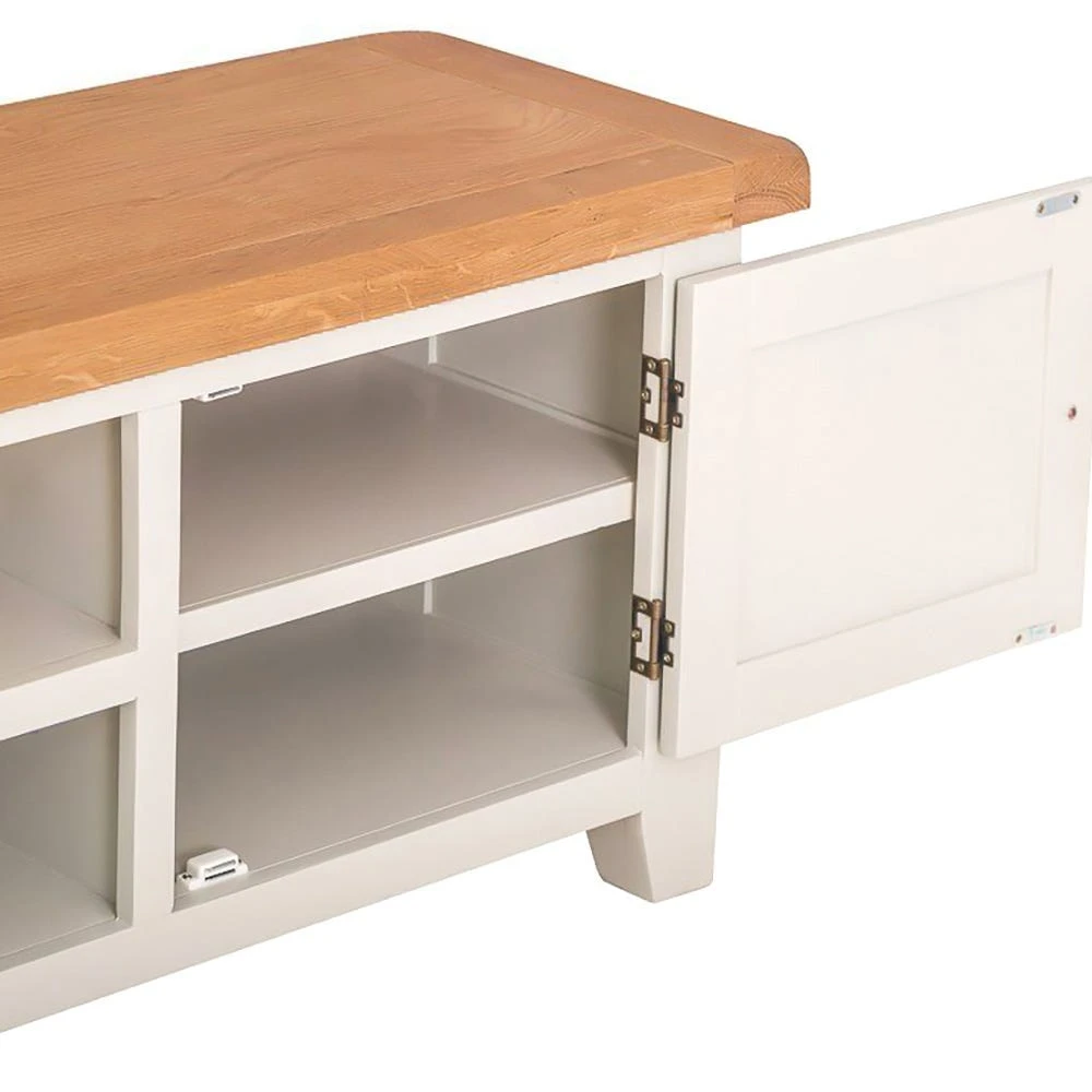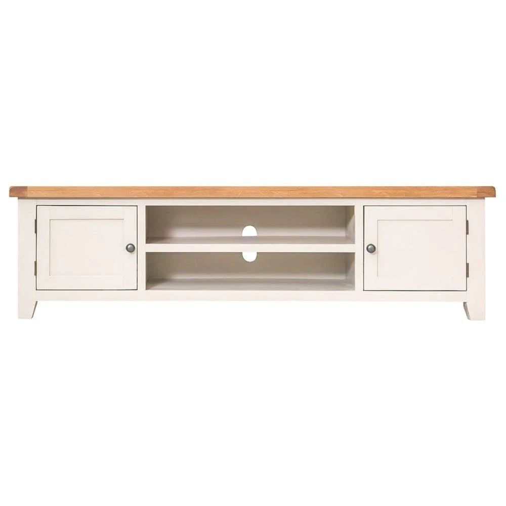 Grab the popcorn and hunker down in front of your favourite film with this Hampshire ivory painted oak extra-large TV unit. It has ample surface area for a wide-screen TV and plenty of smart features to enhance your viewing pleasure. The two shelves are the ideal size for Blu-ray and DVD players, and feature pre-drilled holes for unsightly cables. You can store books, board games or kids’ toys in the pair of generous cupboards.
