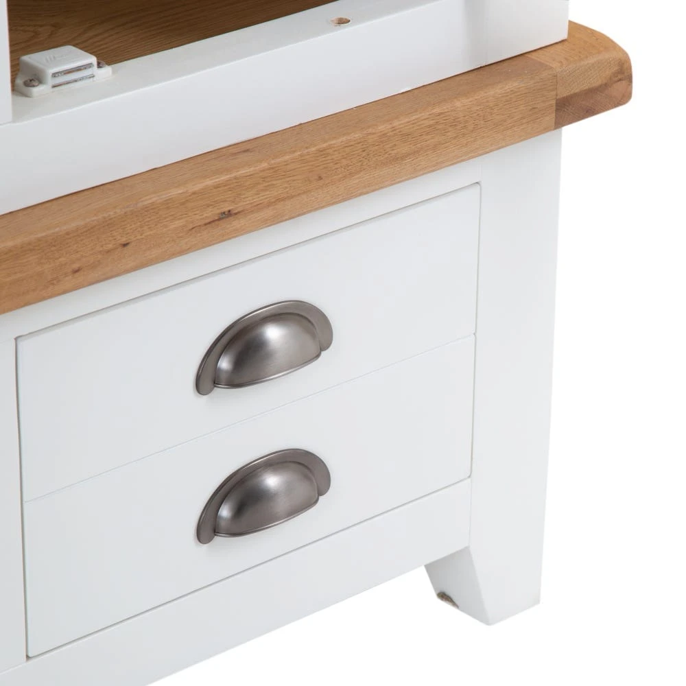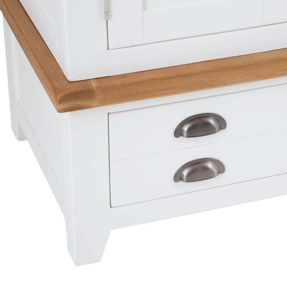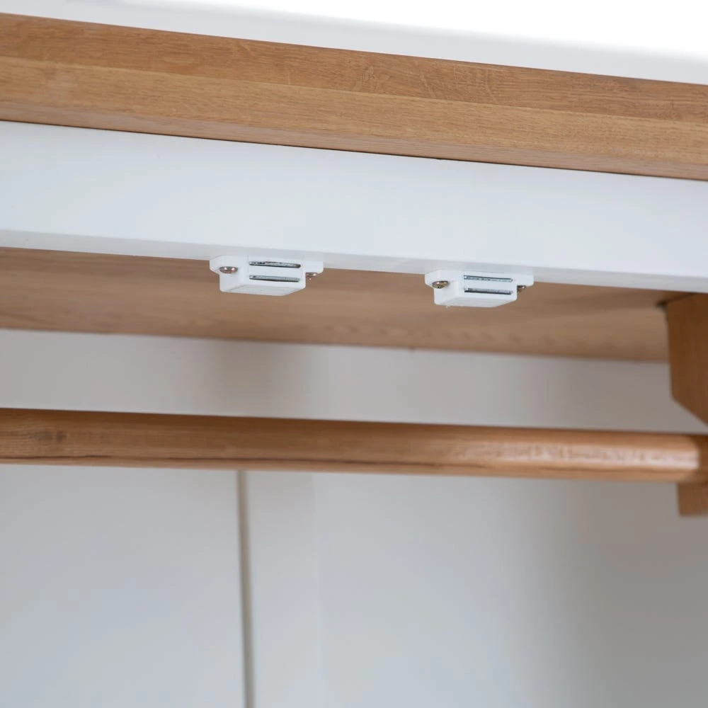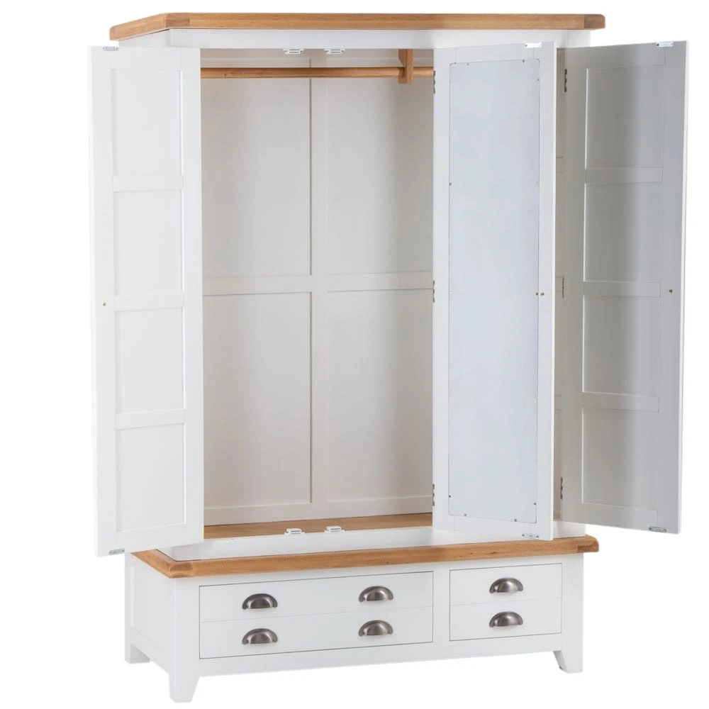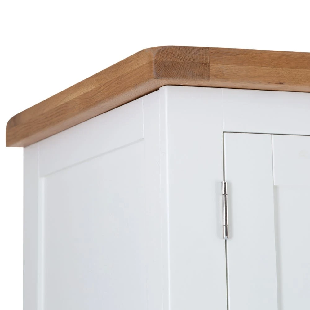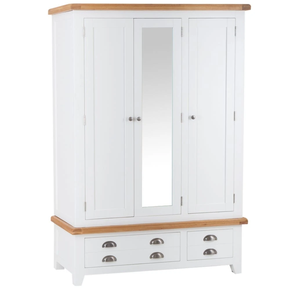 Dedicated follower of fashion? This Hampshire white painted oak 3-door wardrobe with mirror has ample space for your latest finds, as well as a timeless look that’s always in vogue. The minimalist white finish gains warmth from the natural oak top, base and hanging rail. Elegant details such as the panelled doors and interior, chrome cup handles and tapered legs will make this striking wardrobe the focal point of your bedroom.