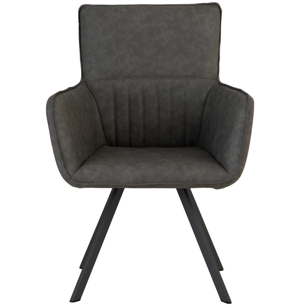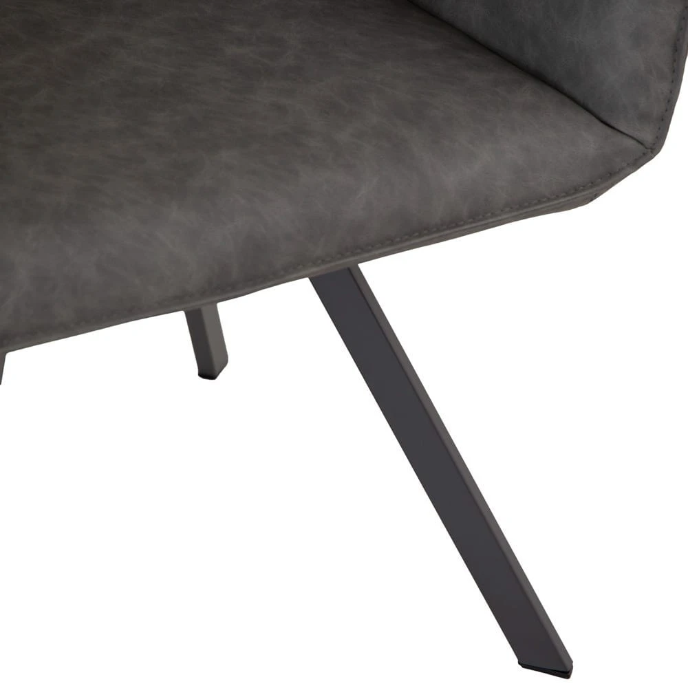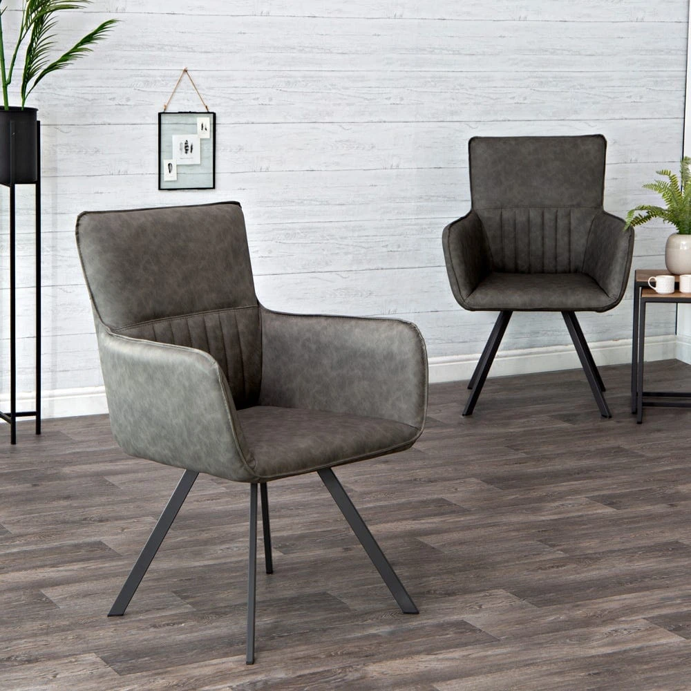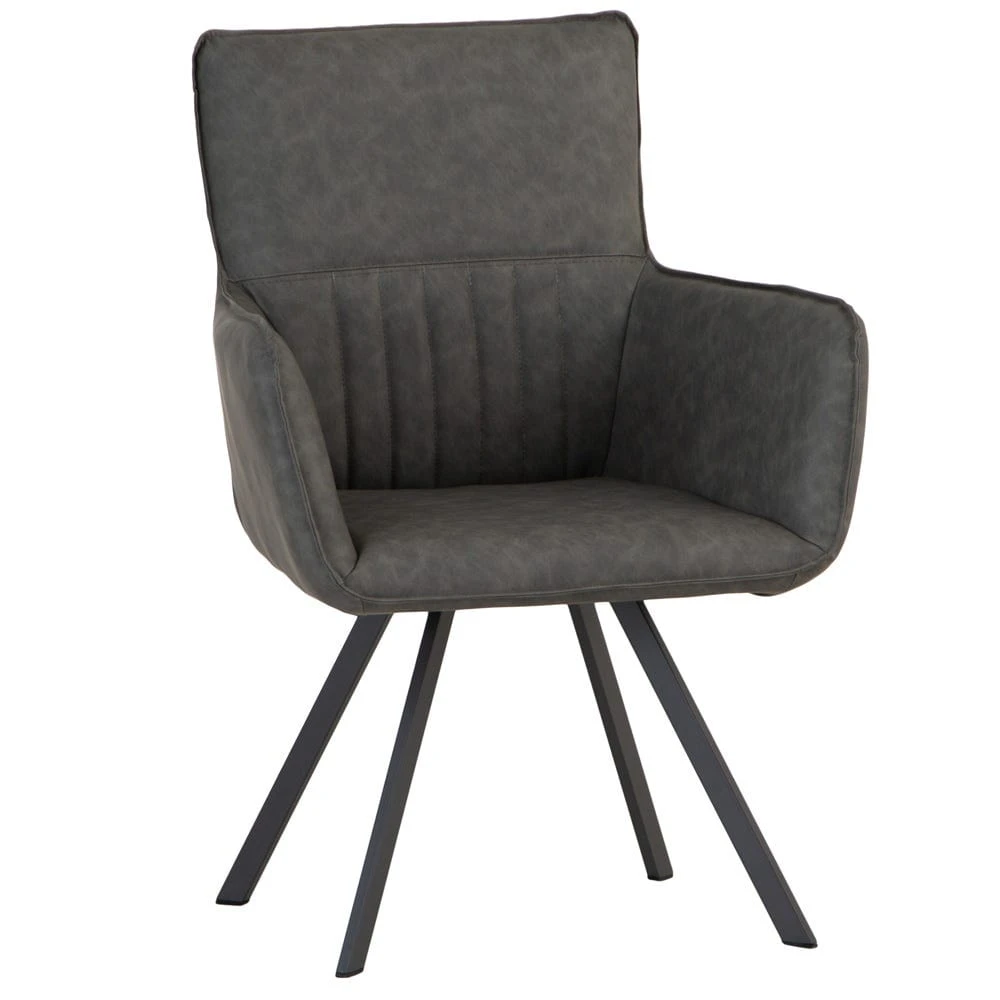 Our Industrial grey carver chair ticks all your seating boxes. Its smooth grey upholstery combines practicality with style, and the lower panelling on the back adds both comfort and visual. The metal legs fan out from the base for a modern geometric effect that offsets the traditional shape of the seat, while the discreet stitching adds an artisan finish.