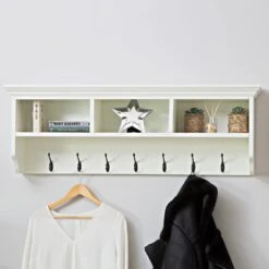 Keep your hallway clean and tidy while showing off your favourite display pieces with our Monaco white large coat rack. There are seven hooks to accommodate outer layers for all the family (and visitors too!), and the black metal contrasts strikingly with our antique white finish. Three cubby holes above the hooks are ideal for books, succulents or scented candles.