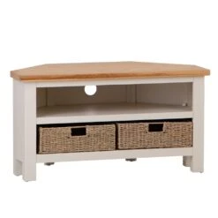 Salisbury Ivory Painted Oak Corner TV Unit With Wicker Baskets