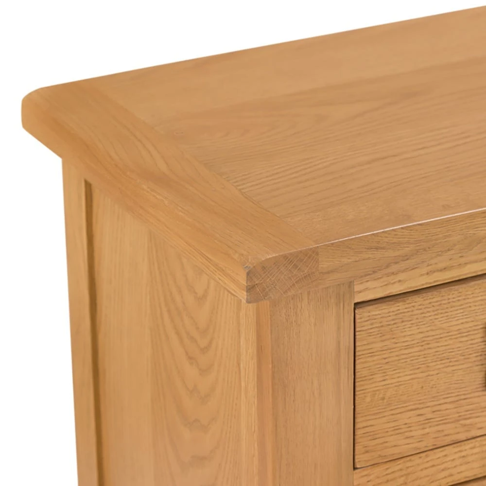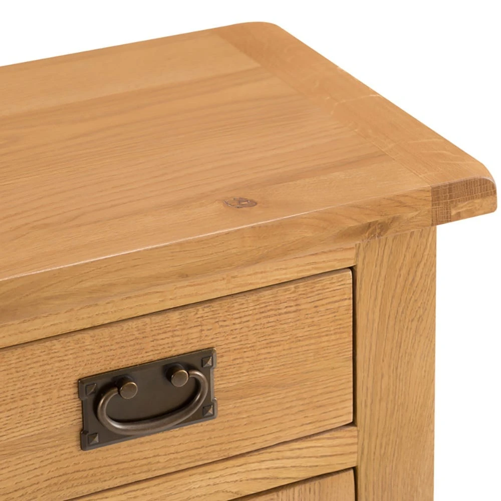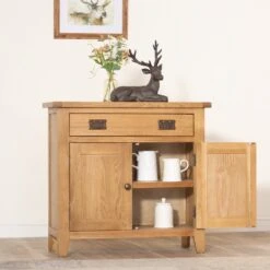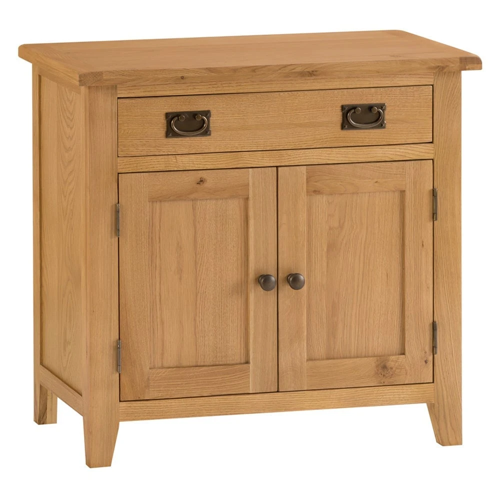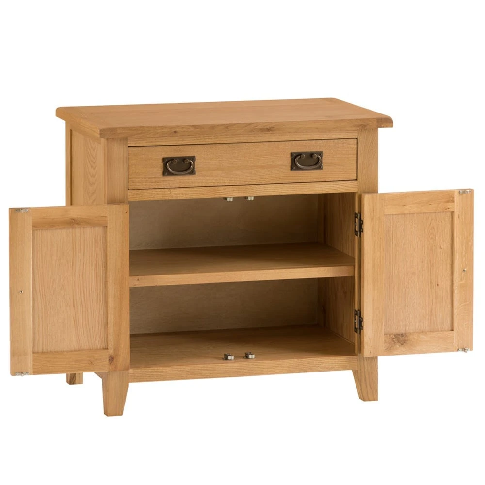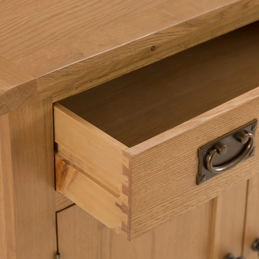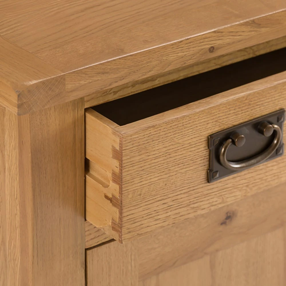 Make the most of cosy spaces with our Rustic oak 2-door small sideboard. At just 35cm deep, this delightfully slimline piece fits neatly into a narrow hallway or next to a dining table. The double cupboard features a pair of shelves for tableware and glasses, and the large drawer is ideal for cooking utensils or household tools.