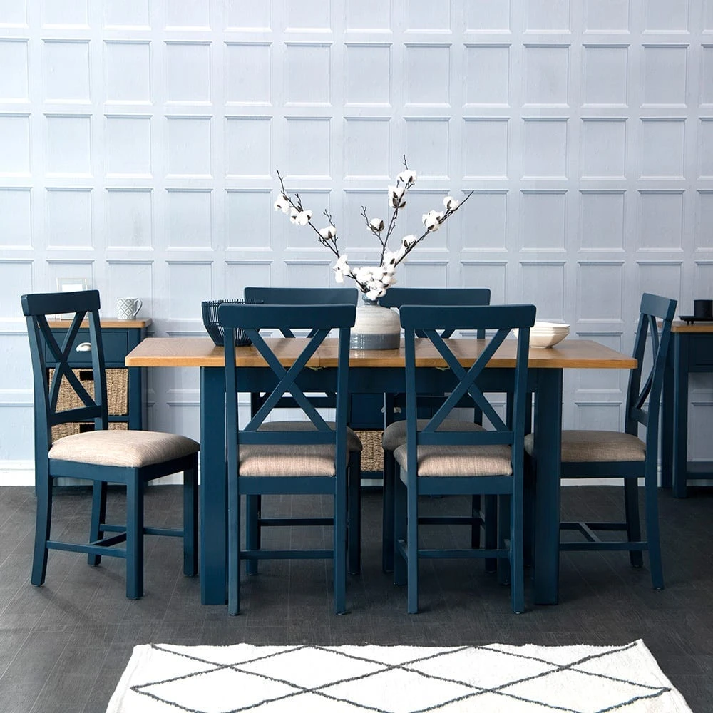 Our Rutland blue painted oak 1.2m extending dining table caters to a whole range of occasions, from family roasts to quick coffees between calls. You can increase its size to 1.6m and seat six in comfort with a central extending leaf that tucks away into the frame again when no longer needed.