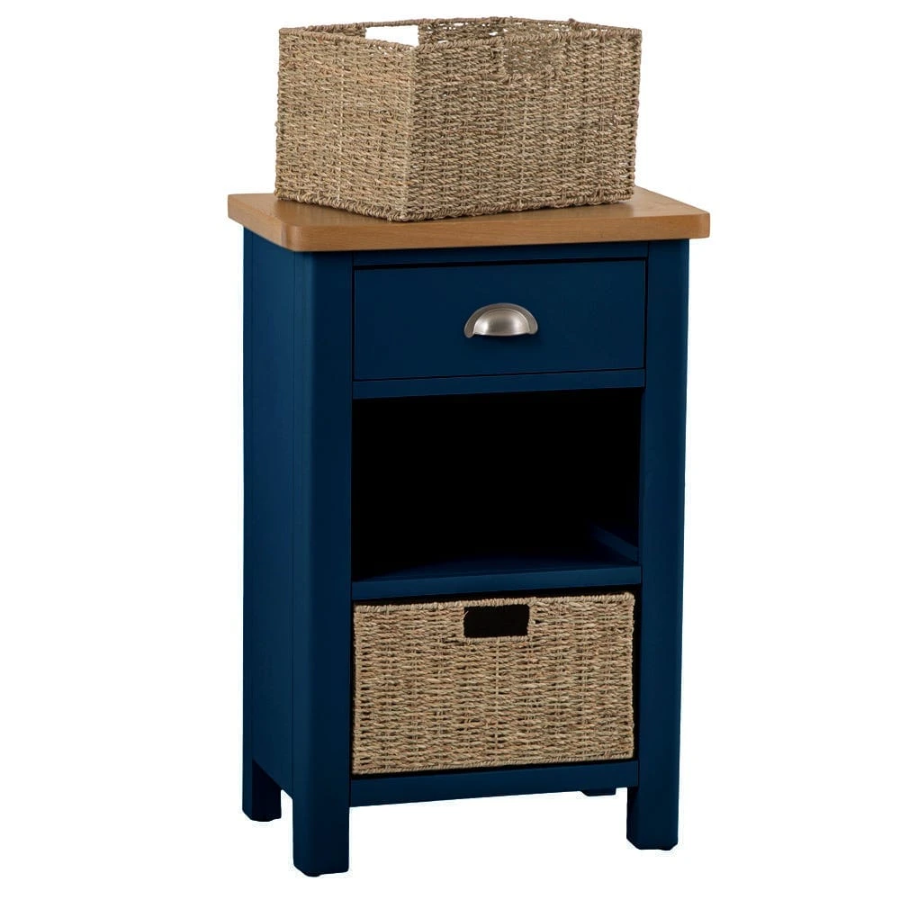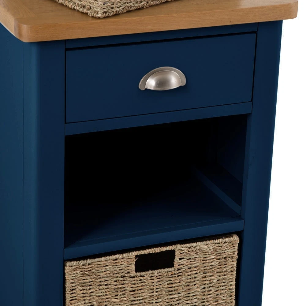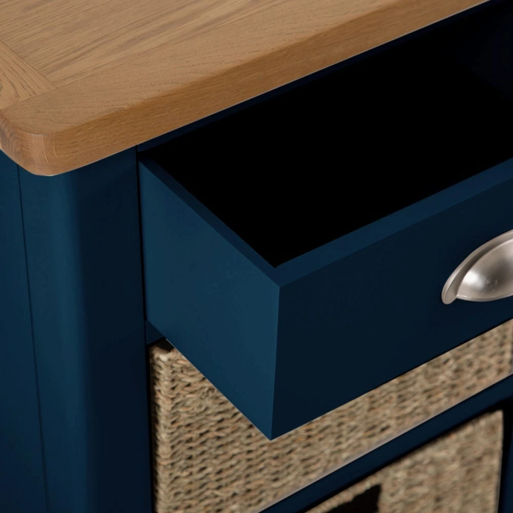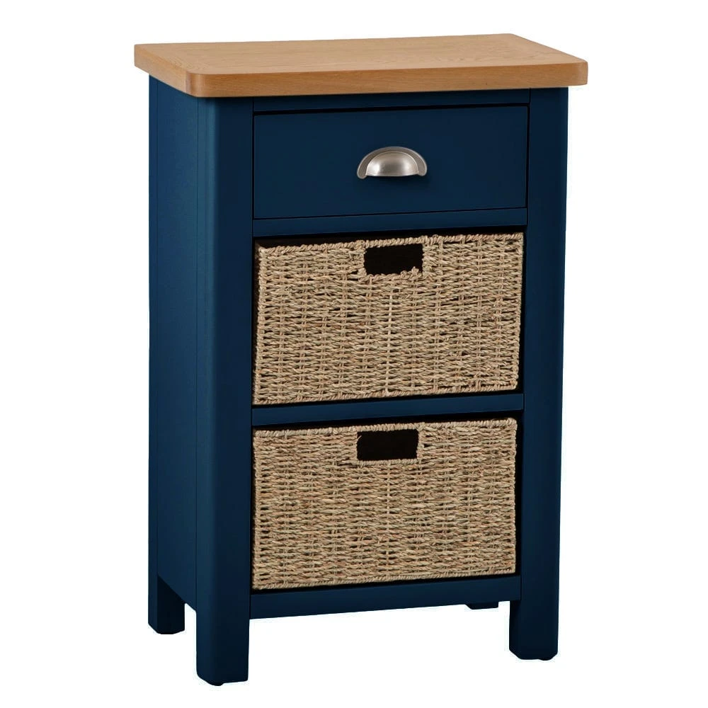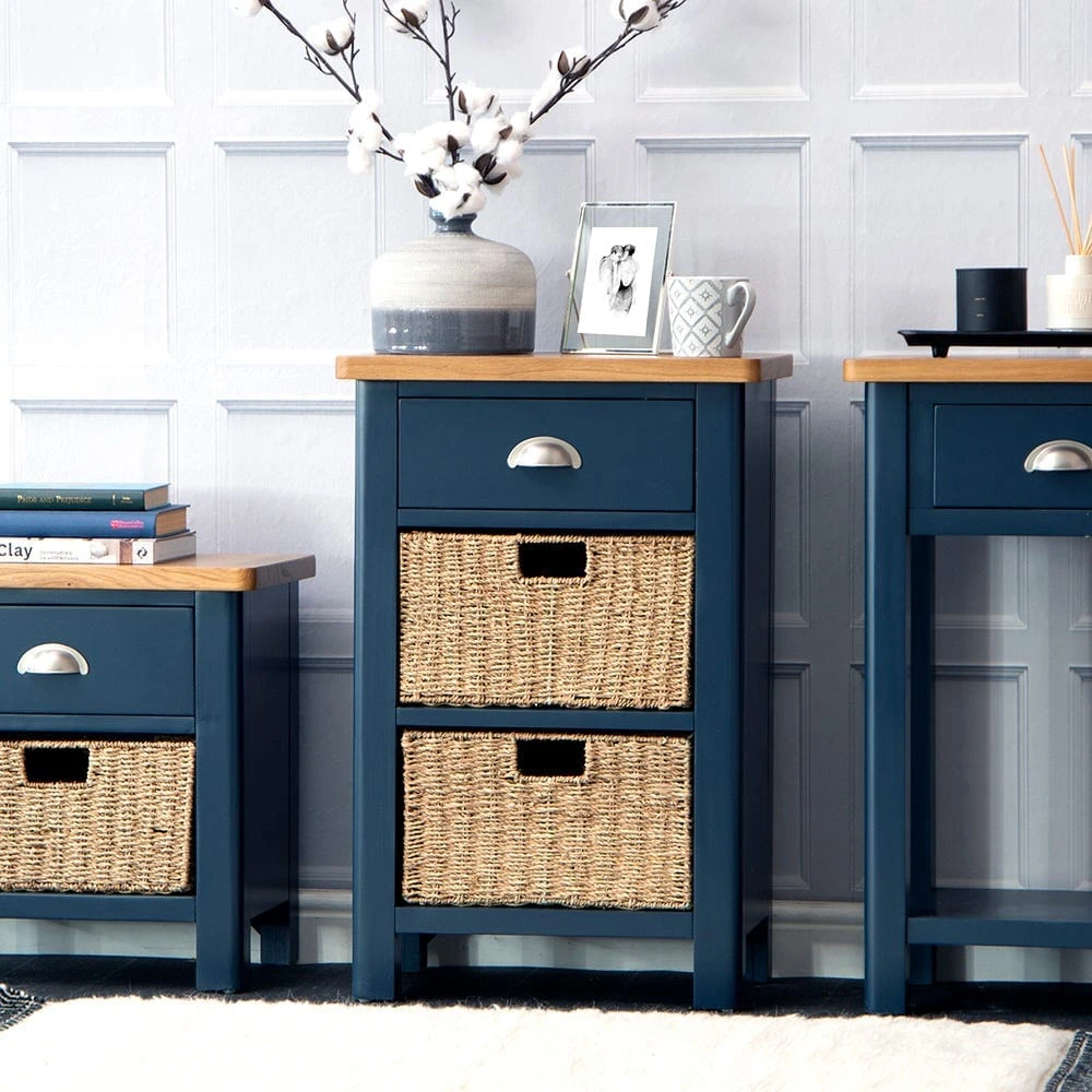 Looking for a storage unit with a difference? Our Rutland blue painted oak 1-drawer 2-wicker basket cabinet is both practical and easy on the eye. It has a pair of baskets that can be removed for ease of access, plus a spacious drawer for all your valuables.