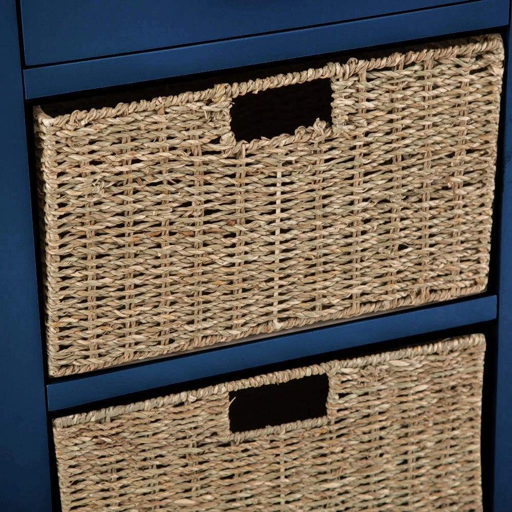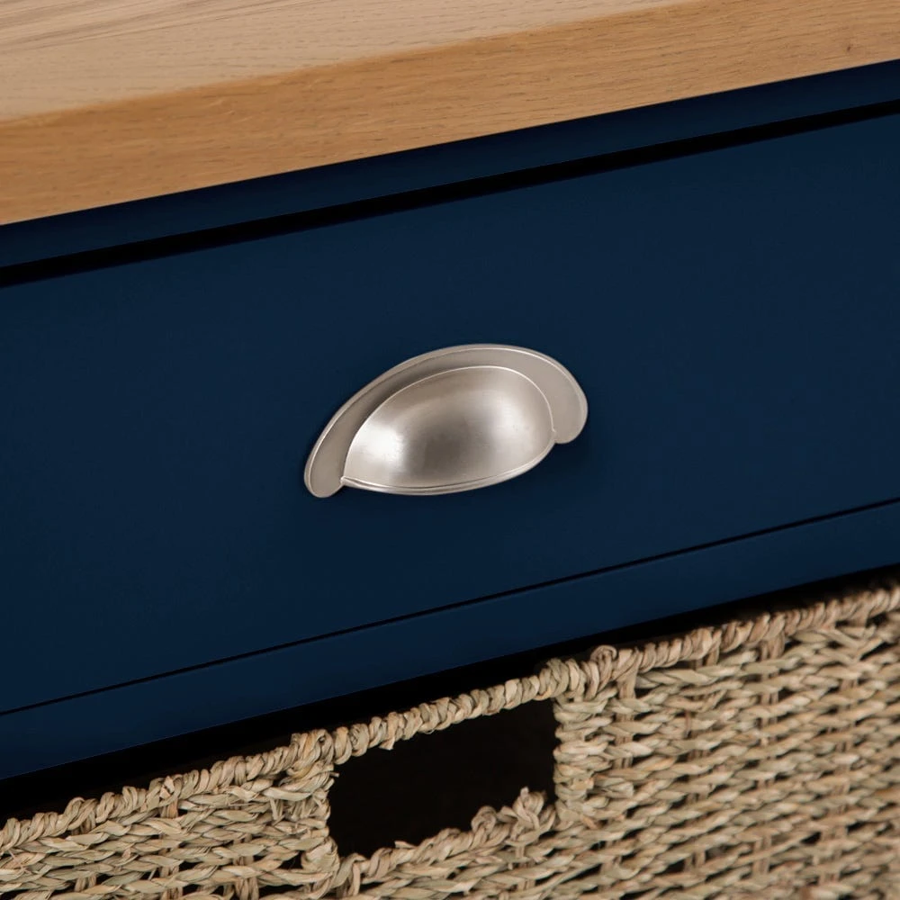 Our contemporary blue finish is offset by the pale oak top and honey-coloured wicker baskets. The chrome cup handle on the drawer adds a glimmer of luxury.