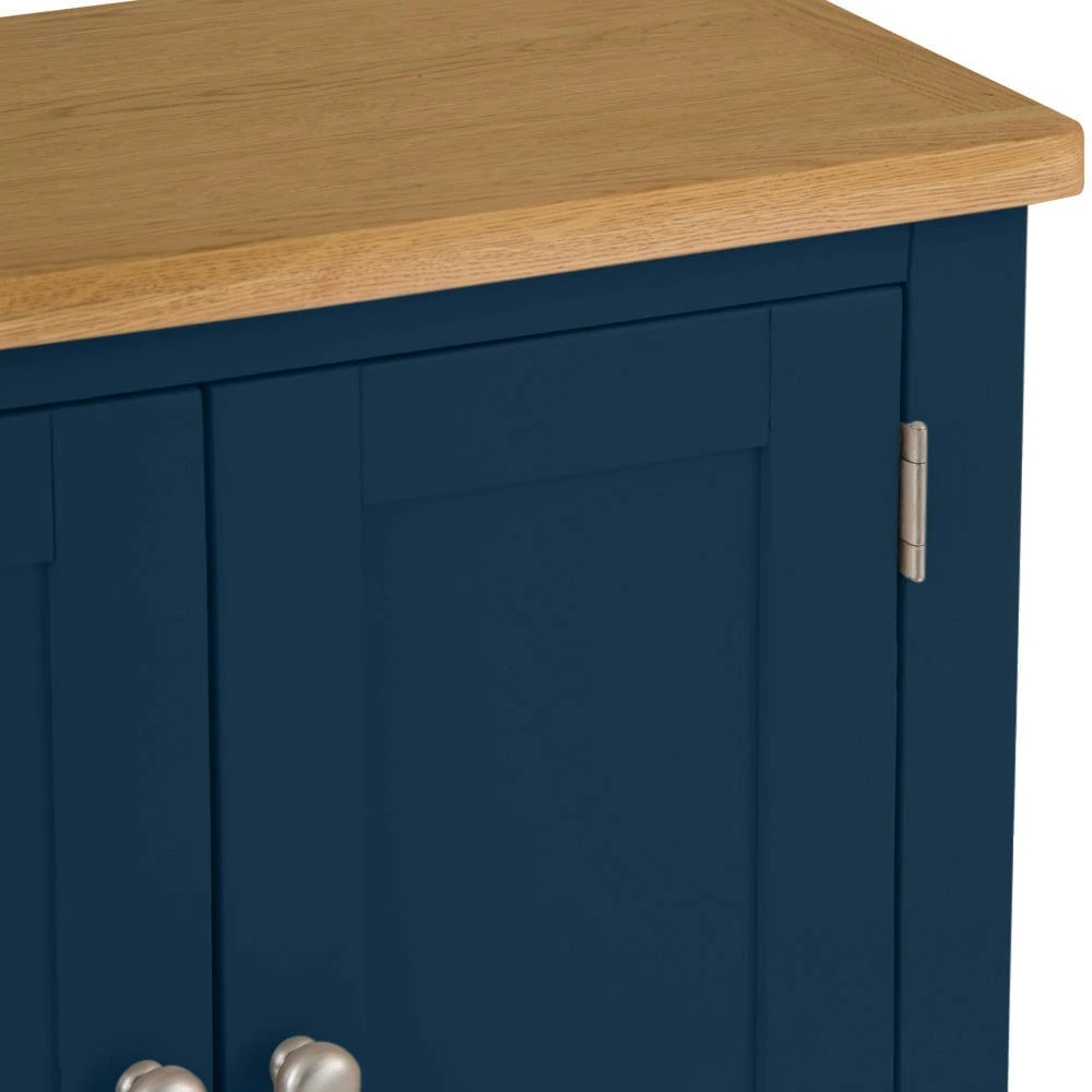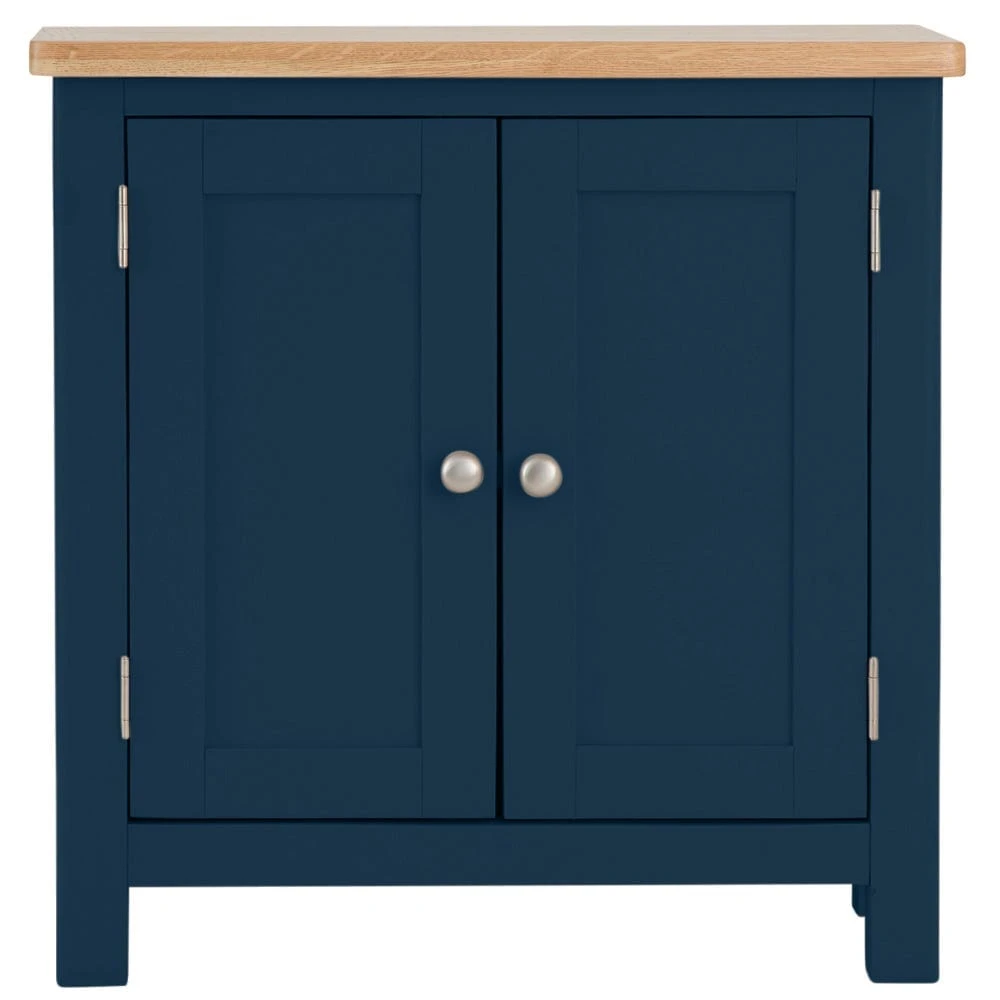 Our delightfully simple Rutland blue painted oak 2-door cupboard combines looks with storage space to make a winning addition to your home. The striking rich blue hue is offset by the brightness of our chrome doorknobs and hinges, and the oak top brings classic warmth to a piece that fits seamlessly into any space.