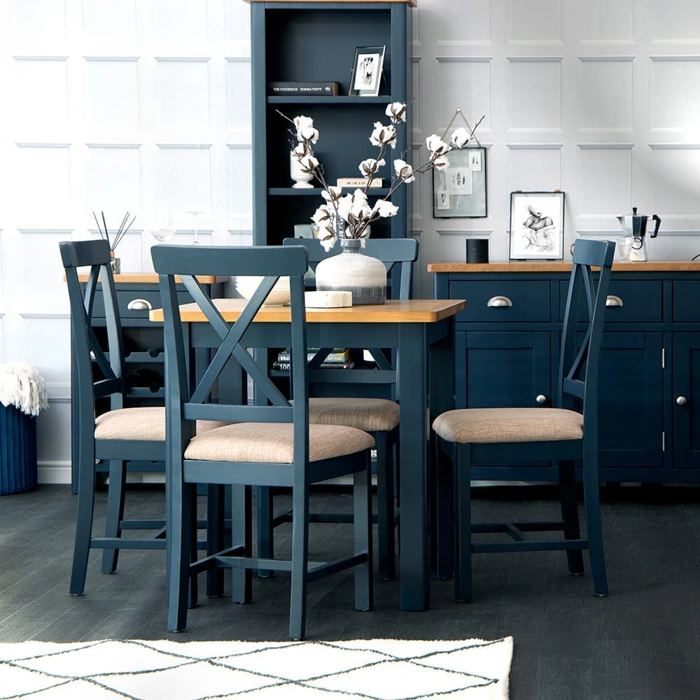 Keep it cosy with our Rutland blue painted oak square fixed top dining table. This splendidly compact piece is ideal for four, and has plenty of country charm to enhance your kitchen.