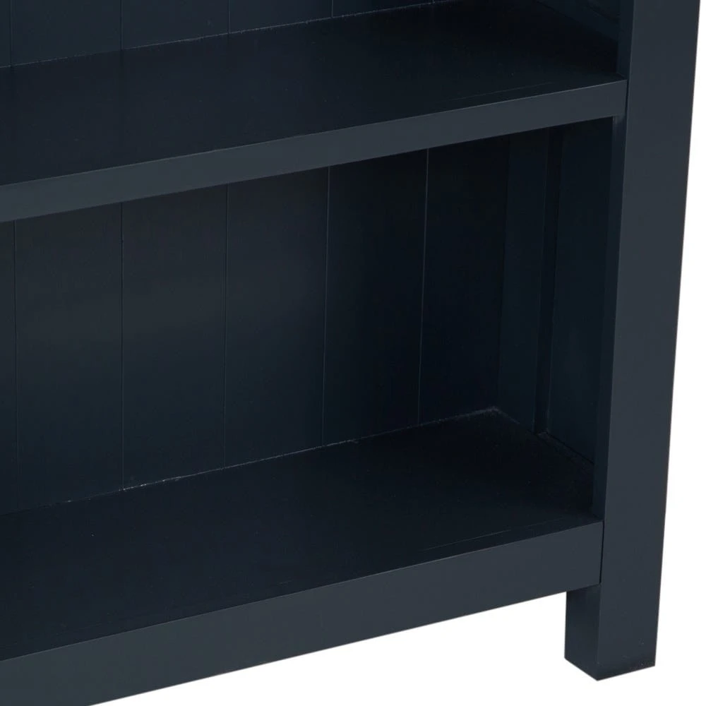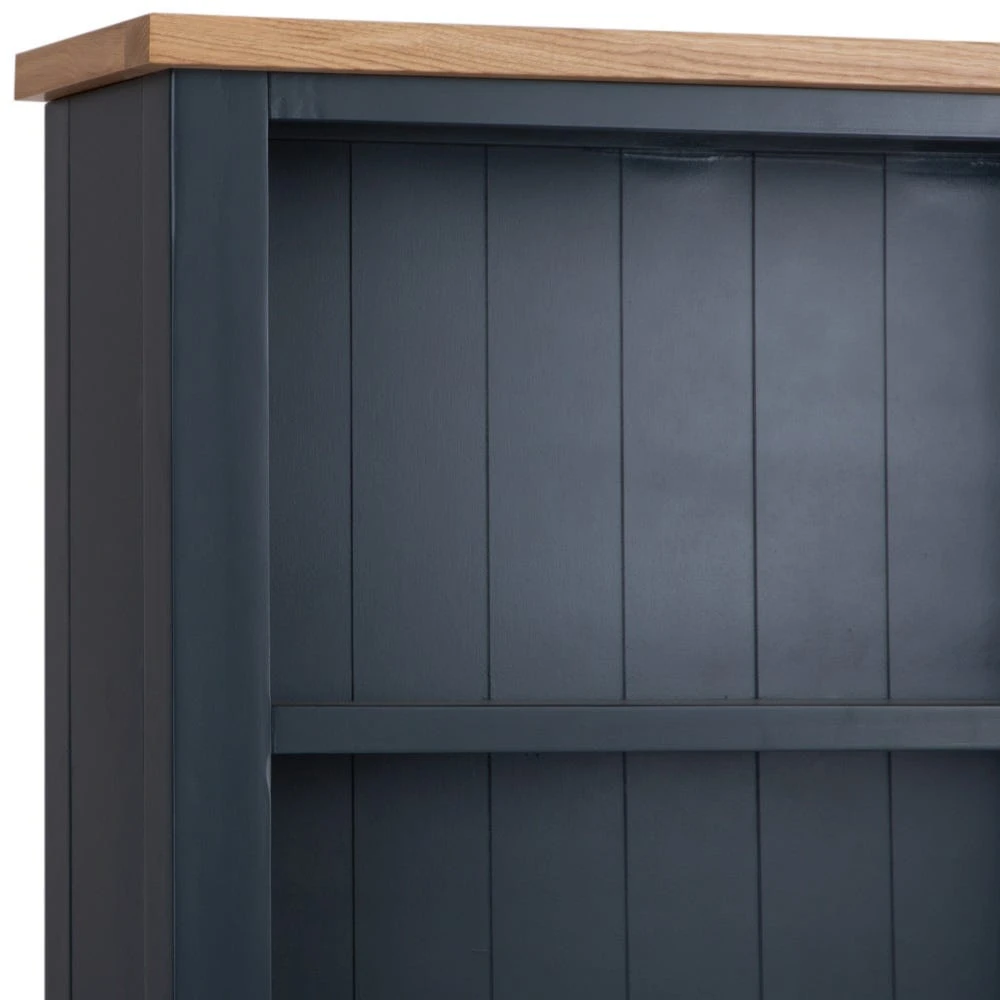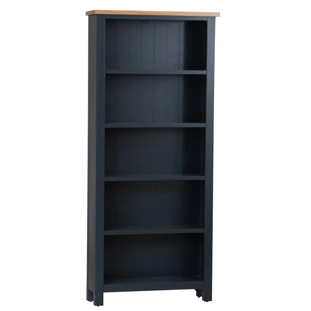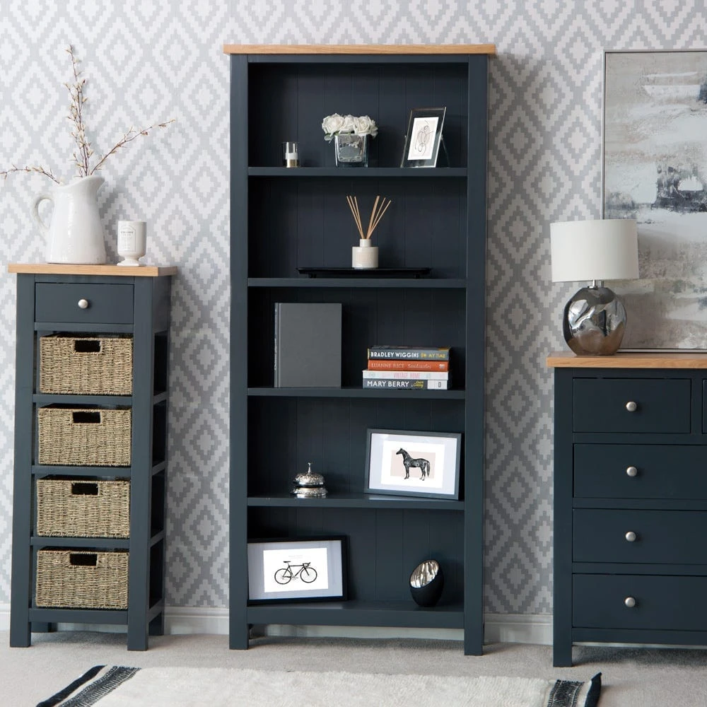 This tall and spacious Salisbury blue painted oak large bookcase is sure to make a statement in your living room. It has five wide, deep shelves that can accommodate both pocket-sized poetry and large cookbooks, and the lipped vertical edges keep your collection securely in place.
