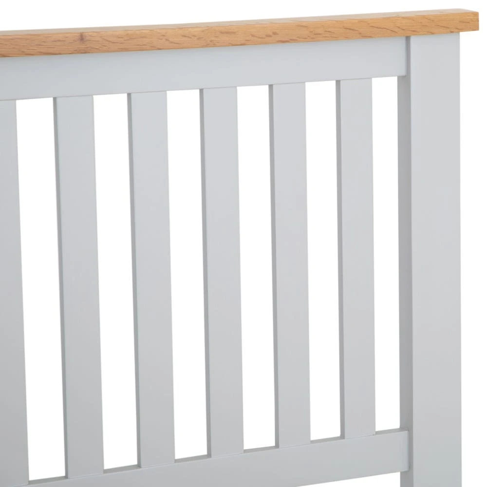 The tall slatted headboard, oak top and chunky proportions showcase the timeless aesthetic and farmhouse charm that define our Salisbury collection. Our pale grey hue brings a calming influence to both classic and contemporary styles of bedroom. Make this bed up with fresh white bed linen to accentuate the featherlight finish, or choose contrasting bold cushions and patterned quilts.