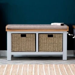 This Salisbury grey painted oak hall bench with wicker baskets offers storage, style and seating. The timeless pale grey finish will sit pretty against both dark and pale walls, and the wicker baskets add an earthy charm. Grab a seat on the comfortable cushion as you wrestle with muddy boots, and then tidy them away in the removable baskets.