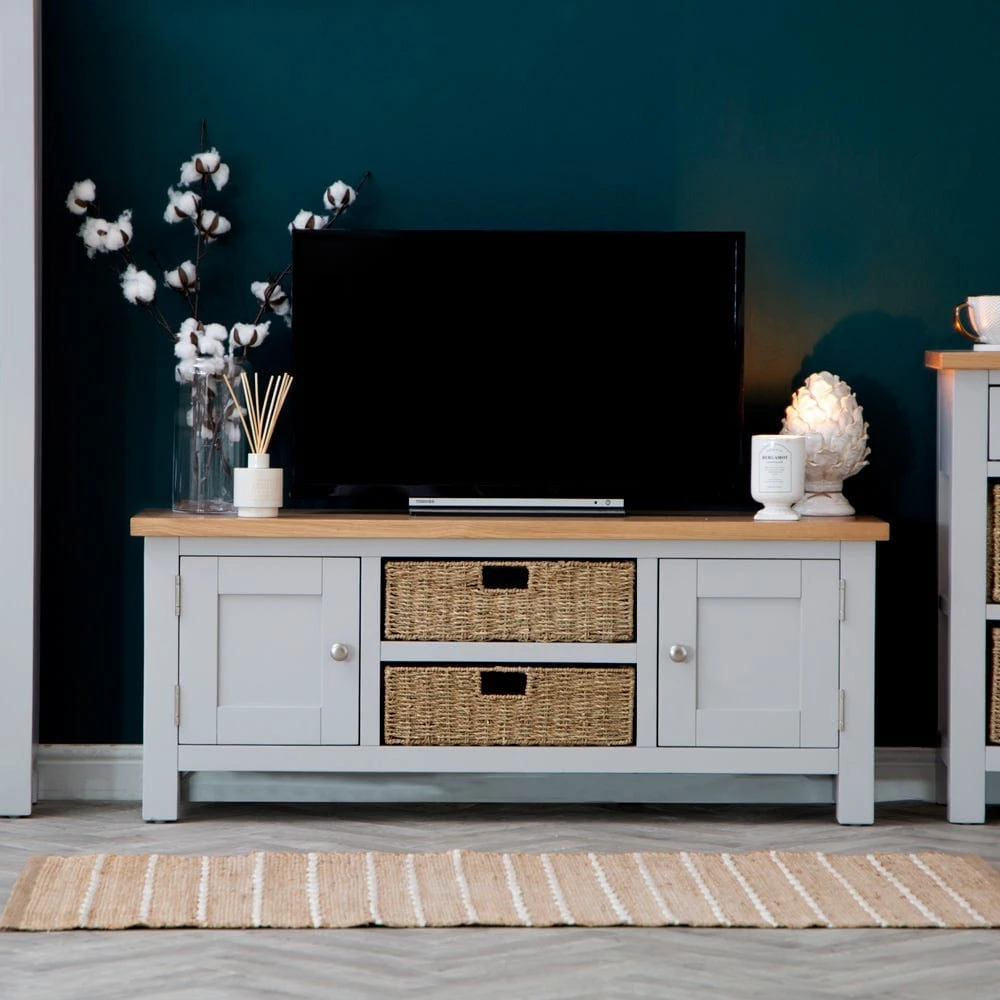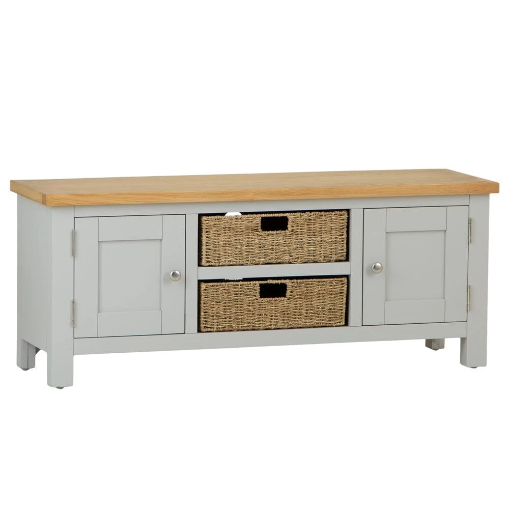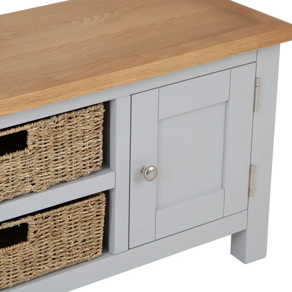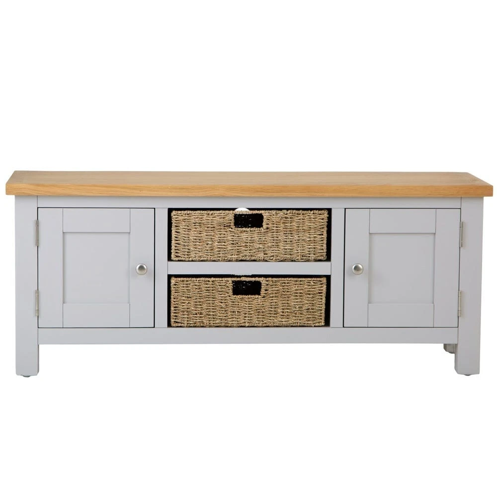 This Salisbury grey painted oak large TV unit with wicker baskets makes a winning addition to boxset binges and video game showdowns. The pale grey finish brightens up any corner of your living room, and the oak top brings a country home feel.