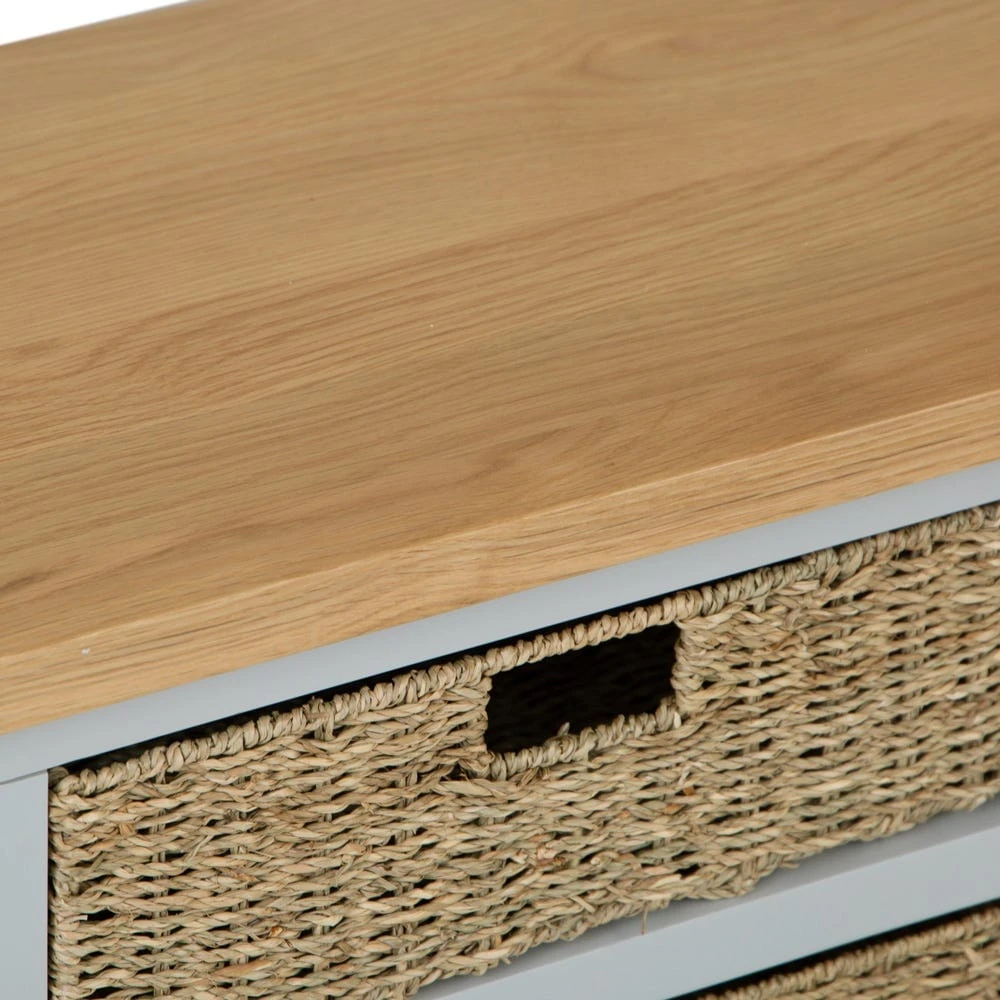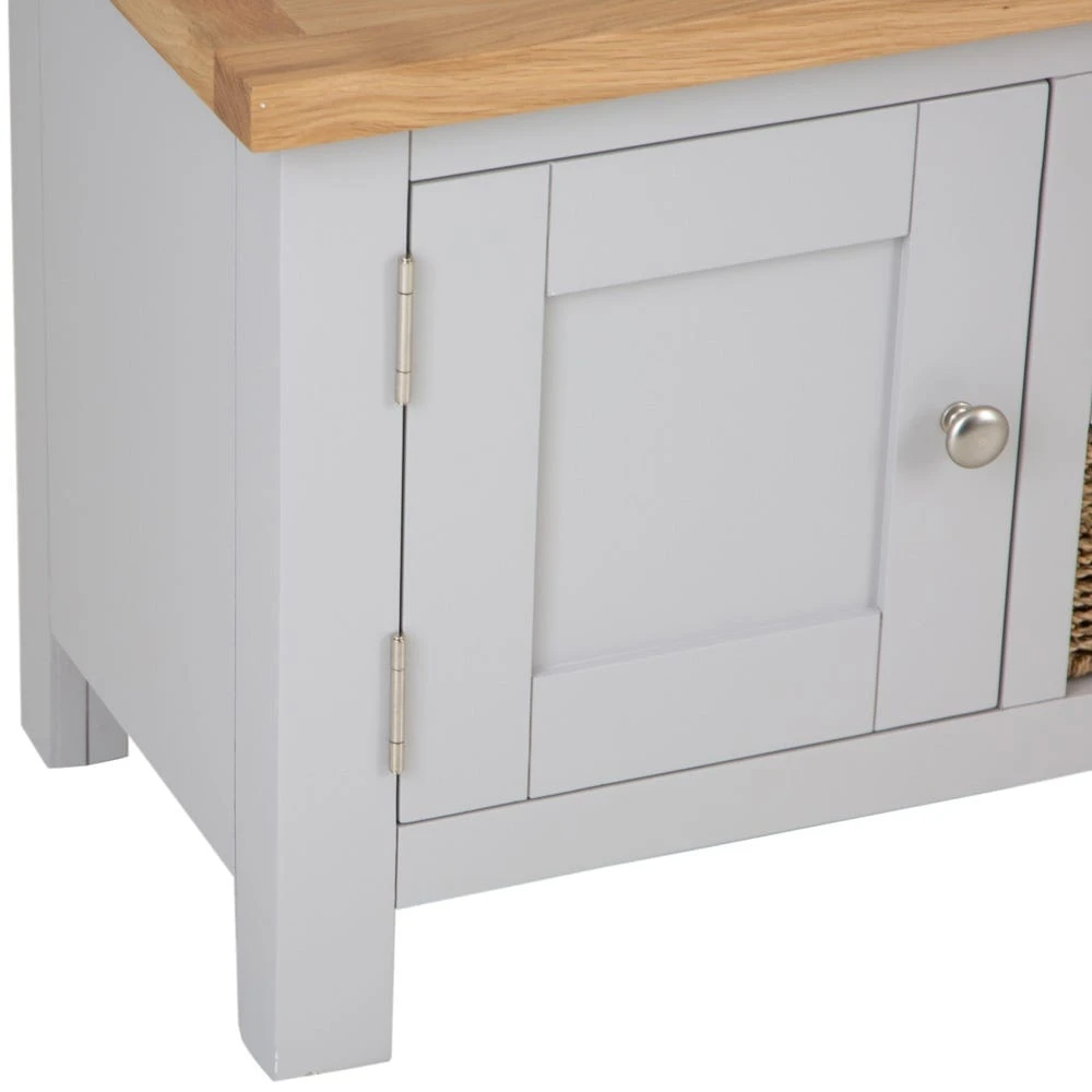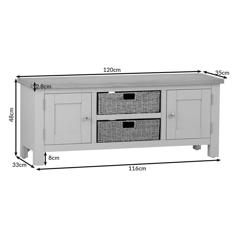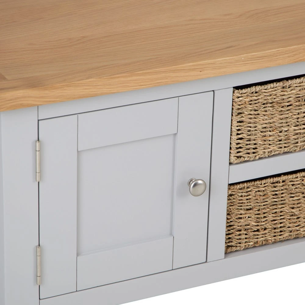This Salisbury grey painted oak large TV unit with wicker baskets makes a winning addition to boxset binges and video game showdowns. The pale grey finish brightens up any corner of your living room, and the oak top brings a country home feel.