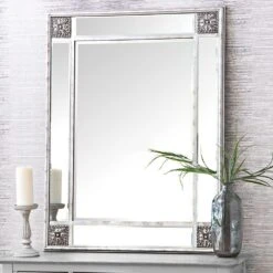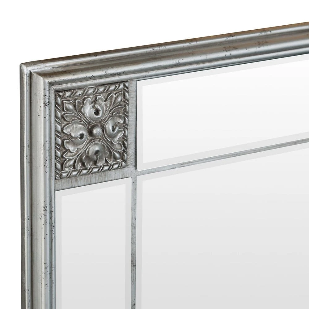 Our perfectly pretty Sienna silver frame rectangular wall mirror (80 x 105cm) will conjure up light and space in any part of your home. The silver frame features an embossed flourish at each corner and is composed of wood with resin detailing for distressed thrift-shop charm.