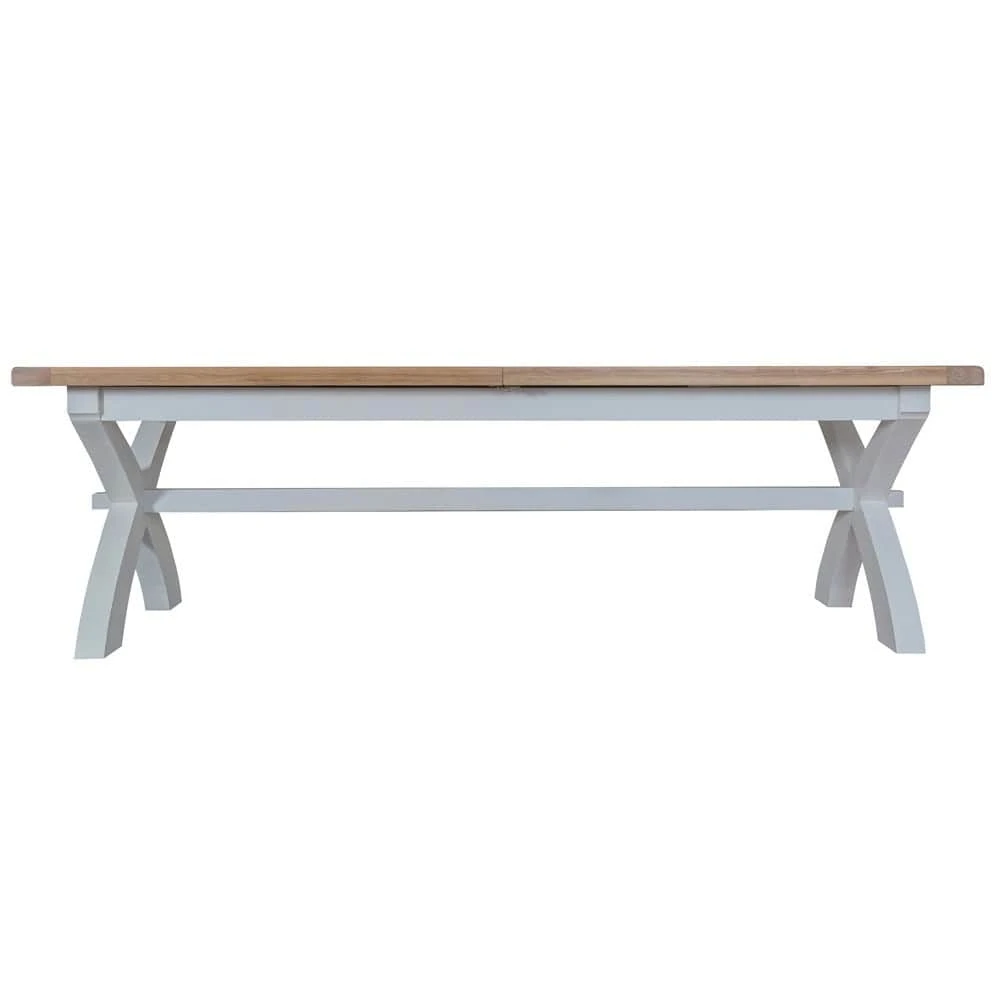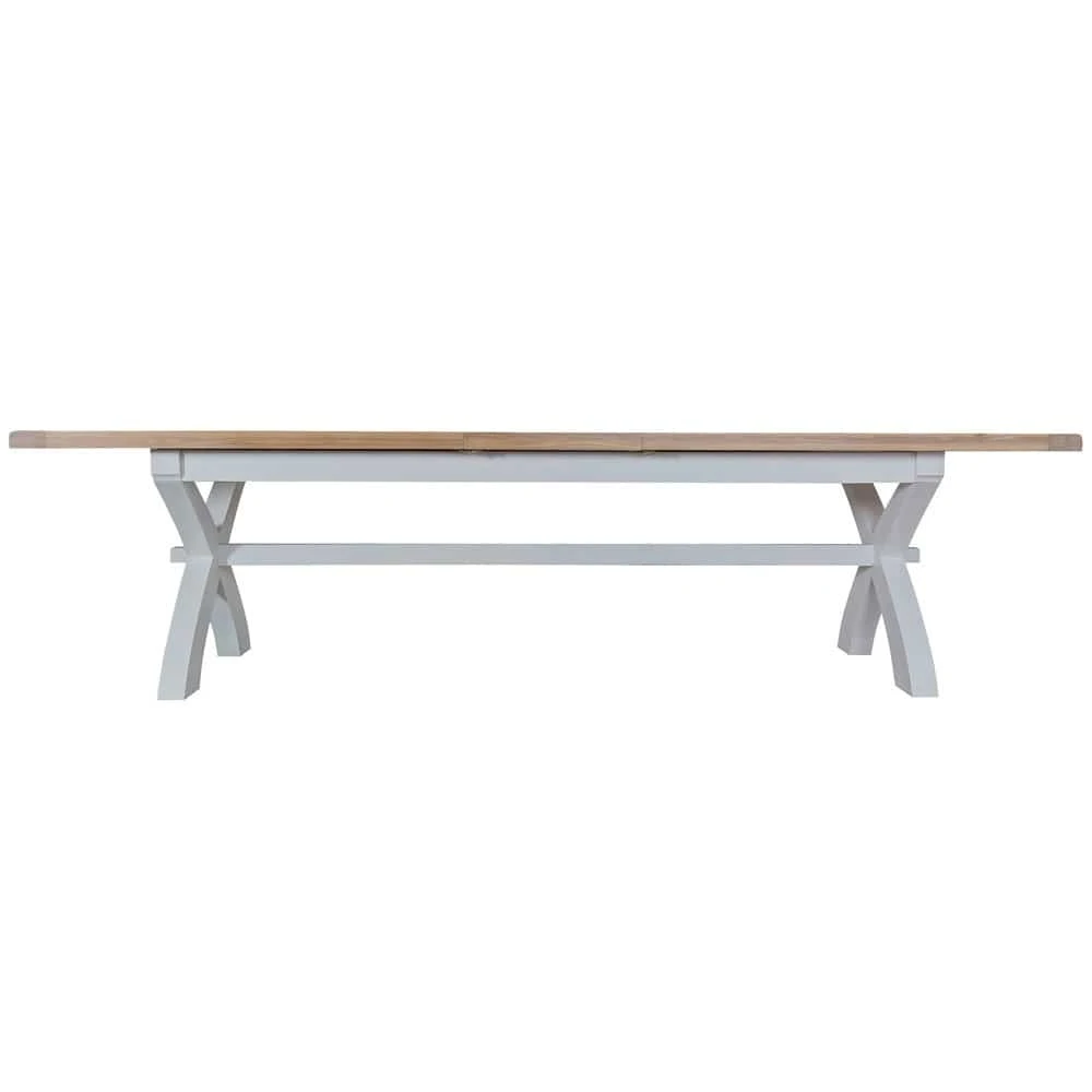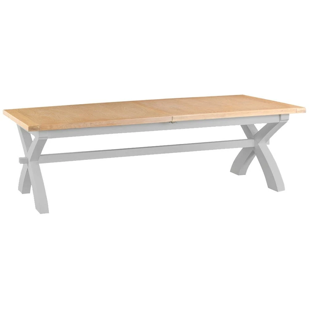 Supersize your next dinner party with this Suffolk grey painted oak 2.5m cross extending dining table. The generous dimensions and sturdy oak top make it perfect for all your best banquets. It extends to a whopping 3m for mass family gatherings and impromptu visits from school mates.