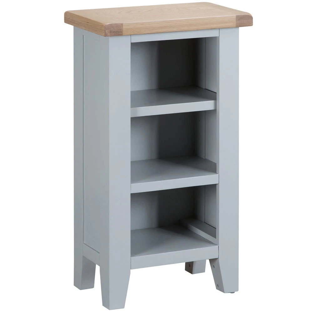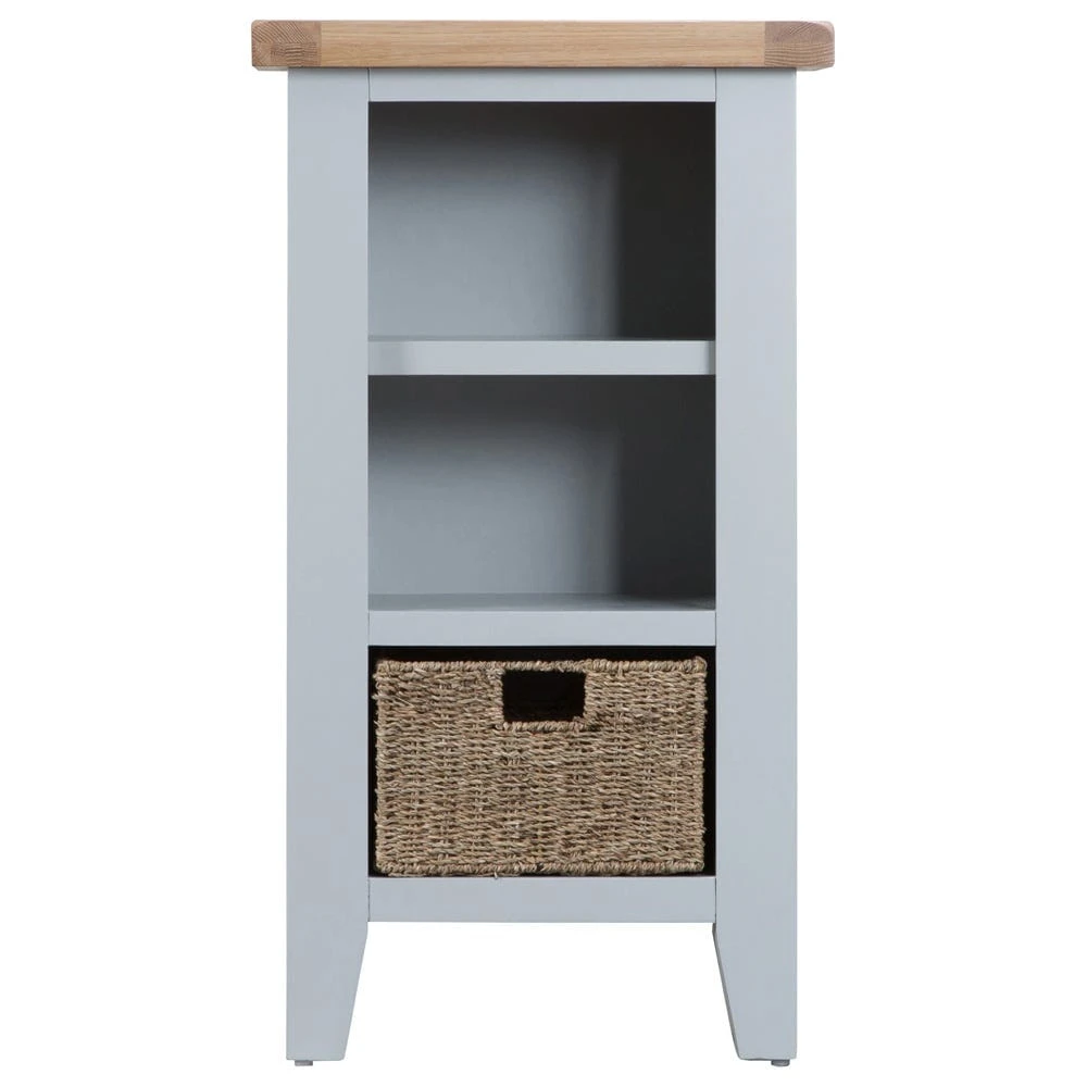 Our Suffolk grey painted small narrow bookcase with wicker basket shows off your favourite reads and gives you bonus storage space too.