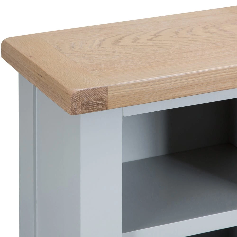 This distinctive bookcase is finished in our elegant pale grey hue, which makes a sophisticated addition to any colour scheme. The natural oak top and chunky tapered legs have a traditional feel, and the seagrass wicker adds texture and warmth.