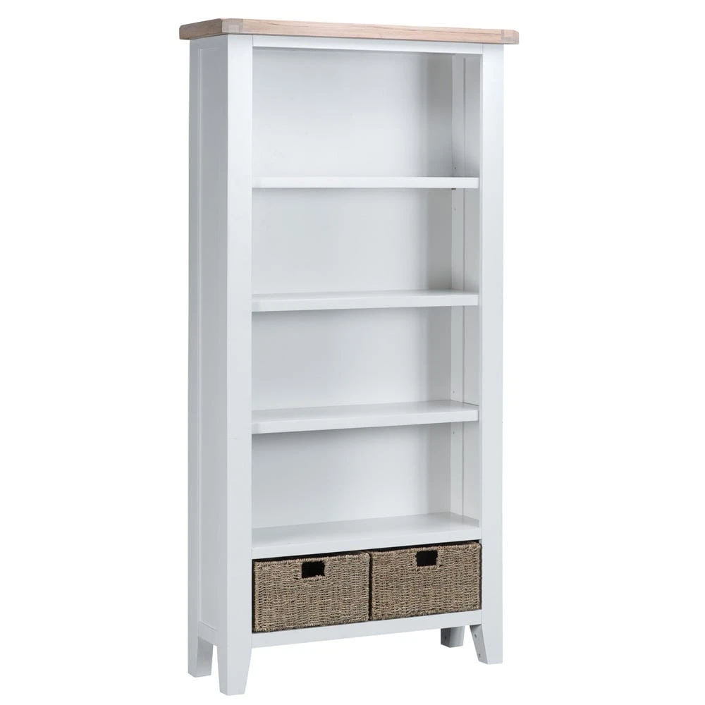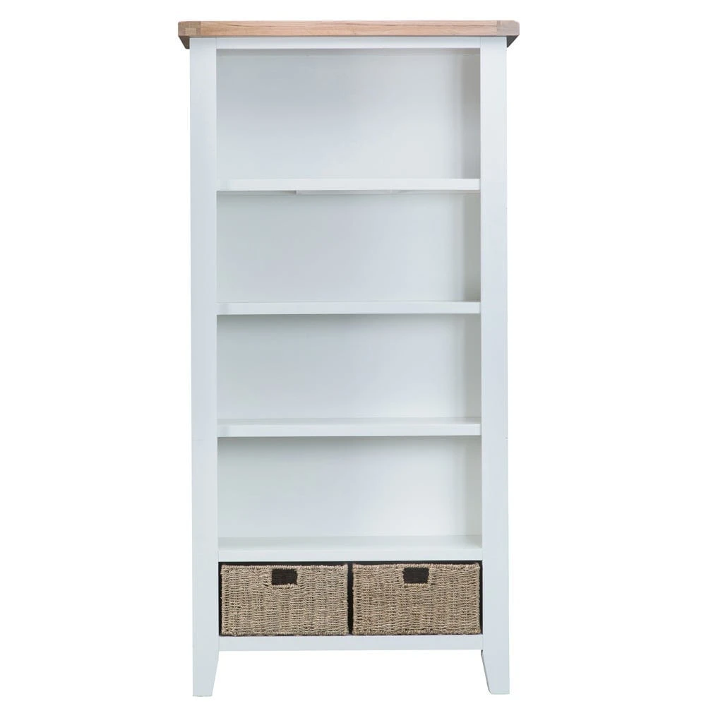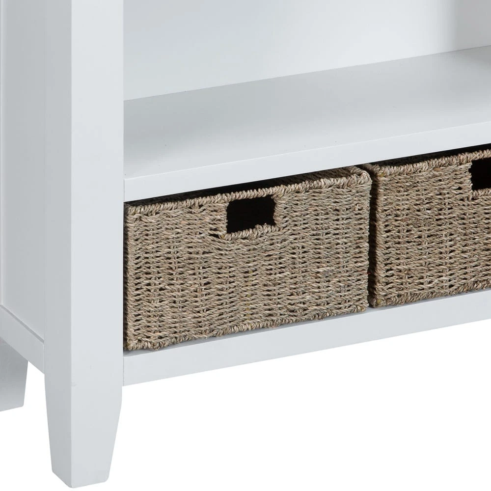 Even more storage comes in the form of two wicker baskets that fit snugly into the bottom shelf. This rustic feel, aided by the hand-painted white wood and light wood highlights at the top of the bookcase, introduces a rural ambience to your living room.