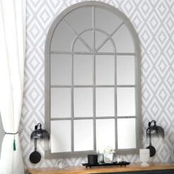 Does your accent wall look just a little bare? Try filling it up with our Toulouse small grey arched window mirror.